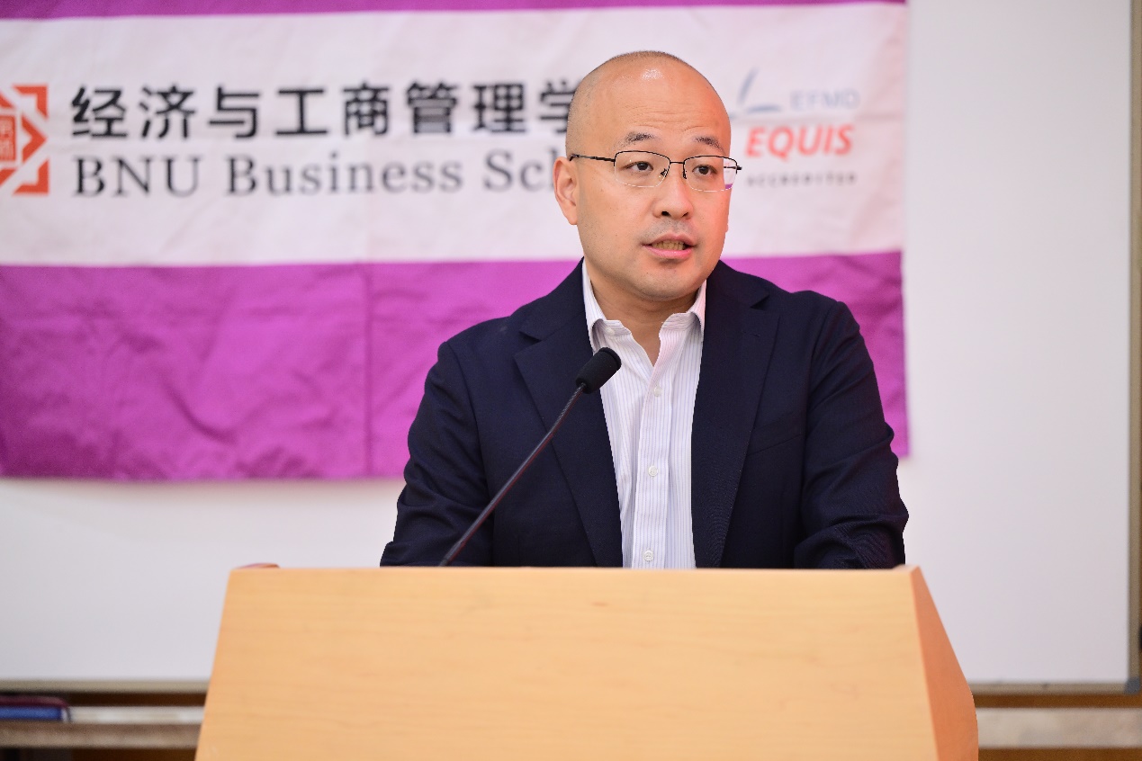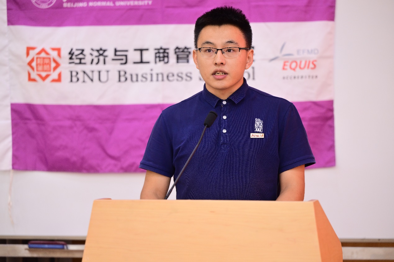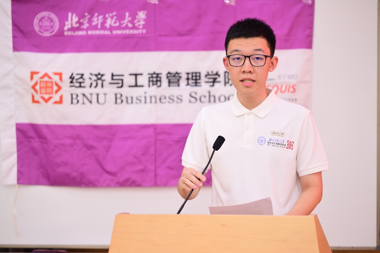 集团财经处处长、公司国际经济与贸易系蔡宏波教授作为教师代表发言。蔡老师在致辞中,明确指出同学们肩负着双重身份:既是传承百年师范荣光与教育报国传统的“北师大人”,又是兼具理性思维与经世济民责任感的“经管人”。他通过分享公司前辈陶大镛先生为国为民做经世致用之学的坚定信念、王善迈先生的家国情怀与求真求实的治学精神,以及一位北师大经管学子毅然扎根西部基层的三则故事,生动展现了北师大经管人始终秉持的家国担当、心系民生与甘于奉献的深厚情怀。他希望同学们能将经济学的理性精神与师范院校的人文关怀深度融合,既有理性之眼,又有仁爱之心,既能构建模型精通算法,又能深入社会解决问题。