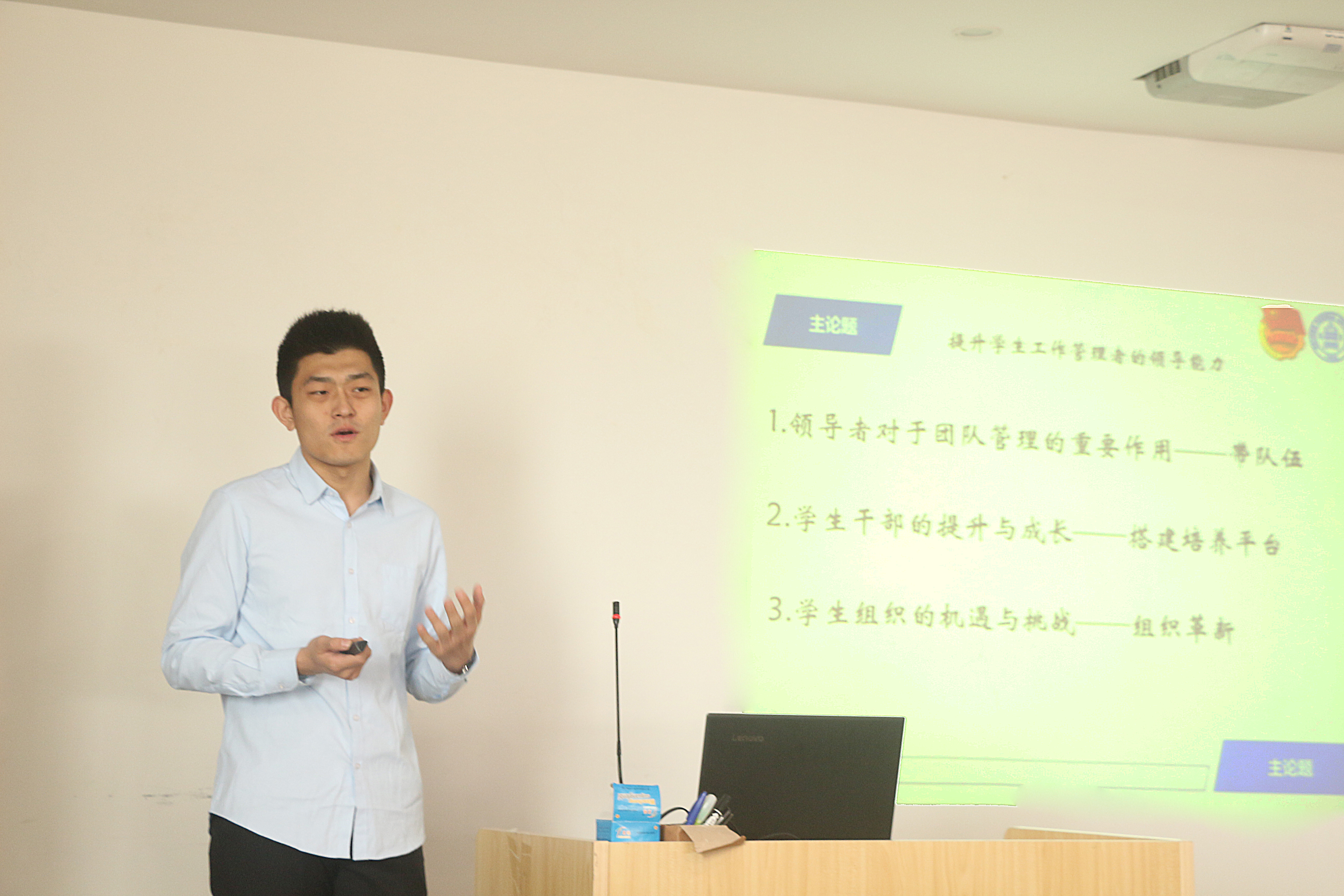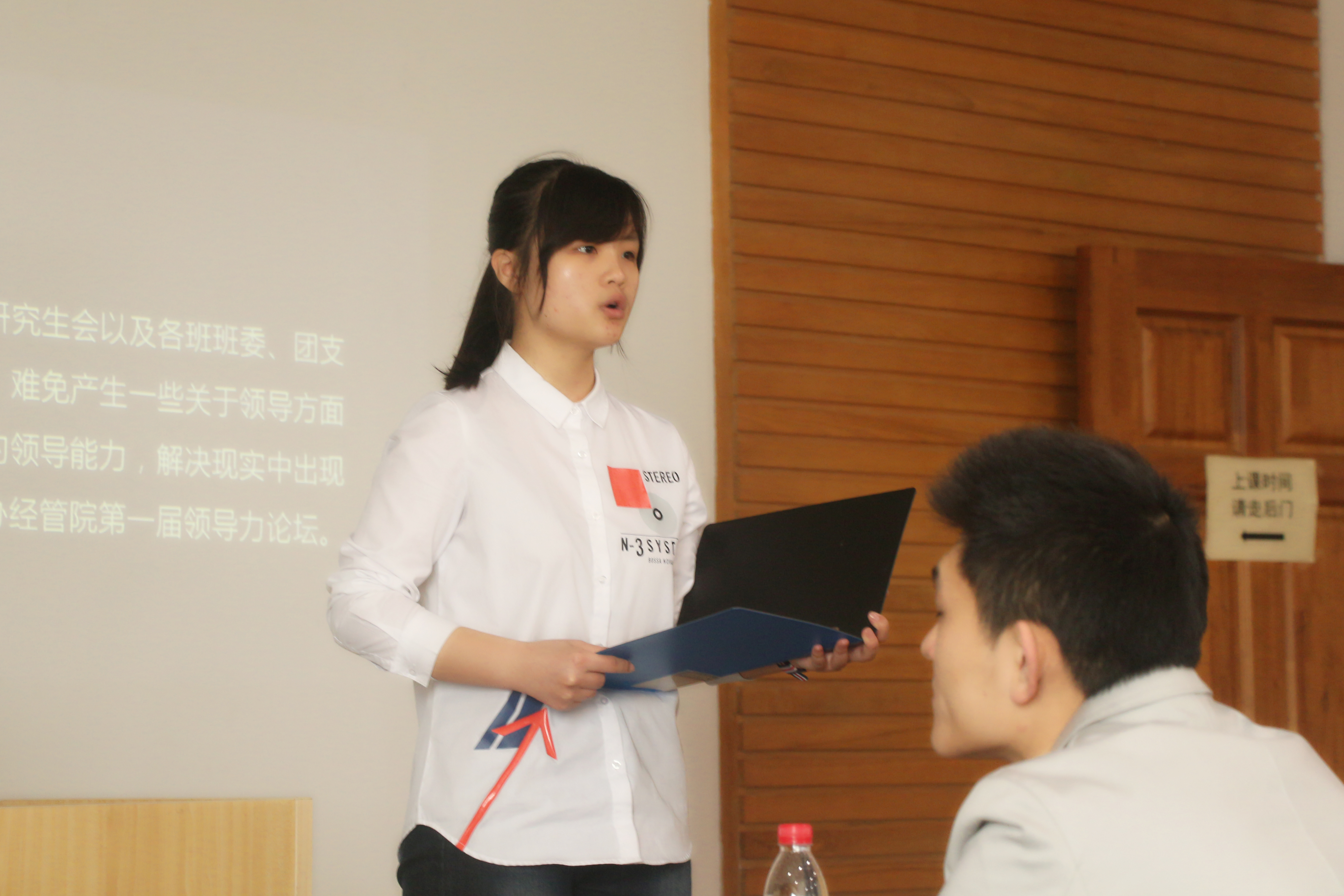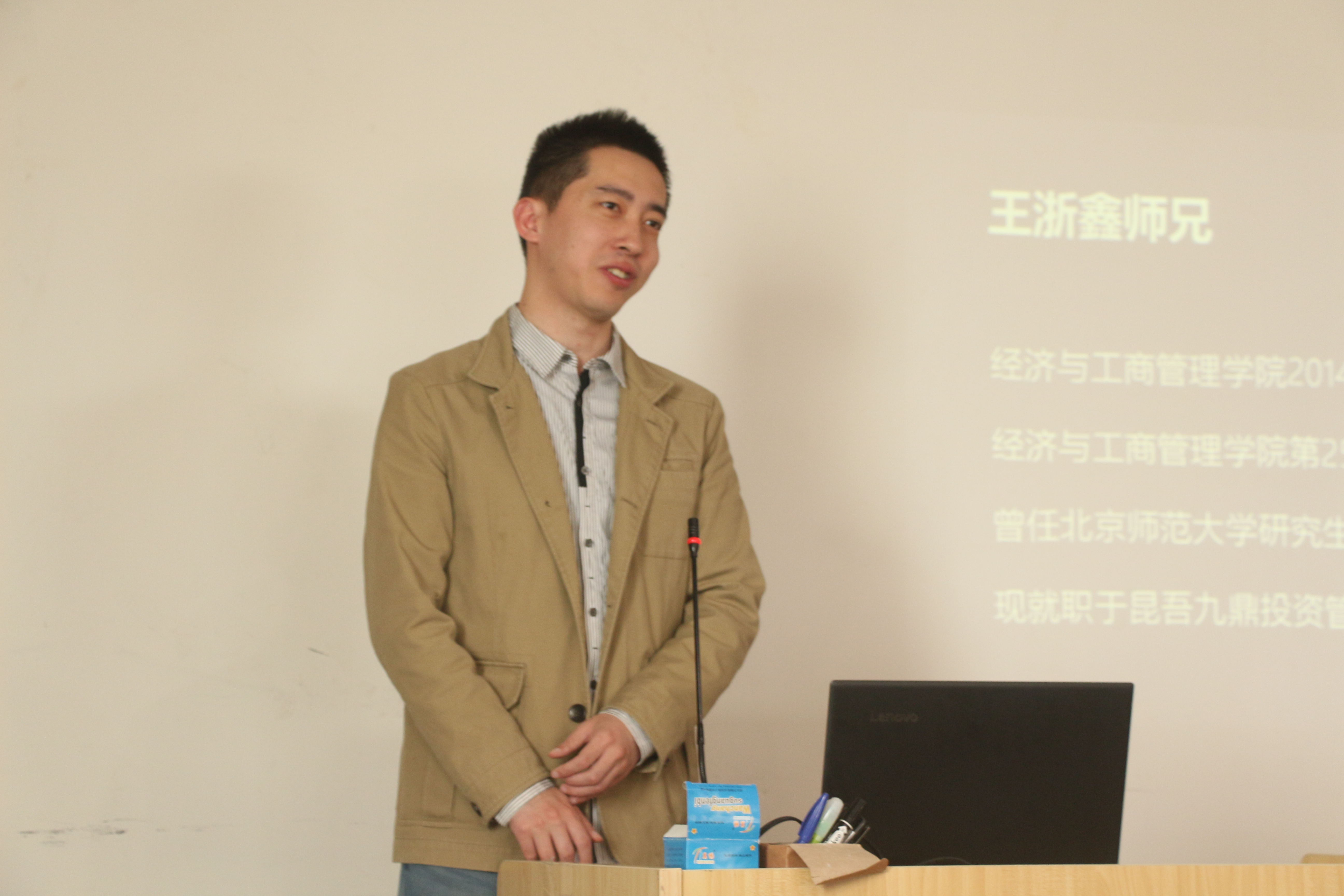 其次,王浙鑫跟我们分享了他的看法。他先介绍了自己,自然亲切的语言很快拉近了与同学们的距离。接着,他从如何培养接班人入手,从亲和力、示范效应等方面讨论各种领导风格的利弊,最后,他结合自己的工作经历,鼓励同学们思考员工工作与职场实际工作的关系。