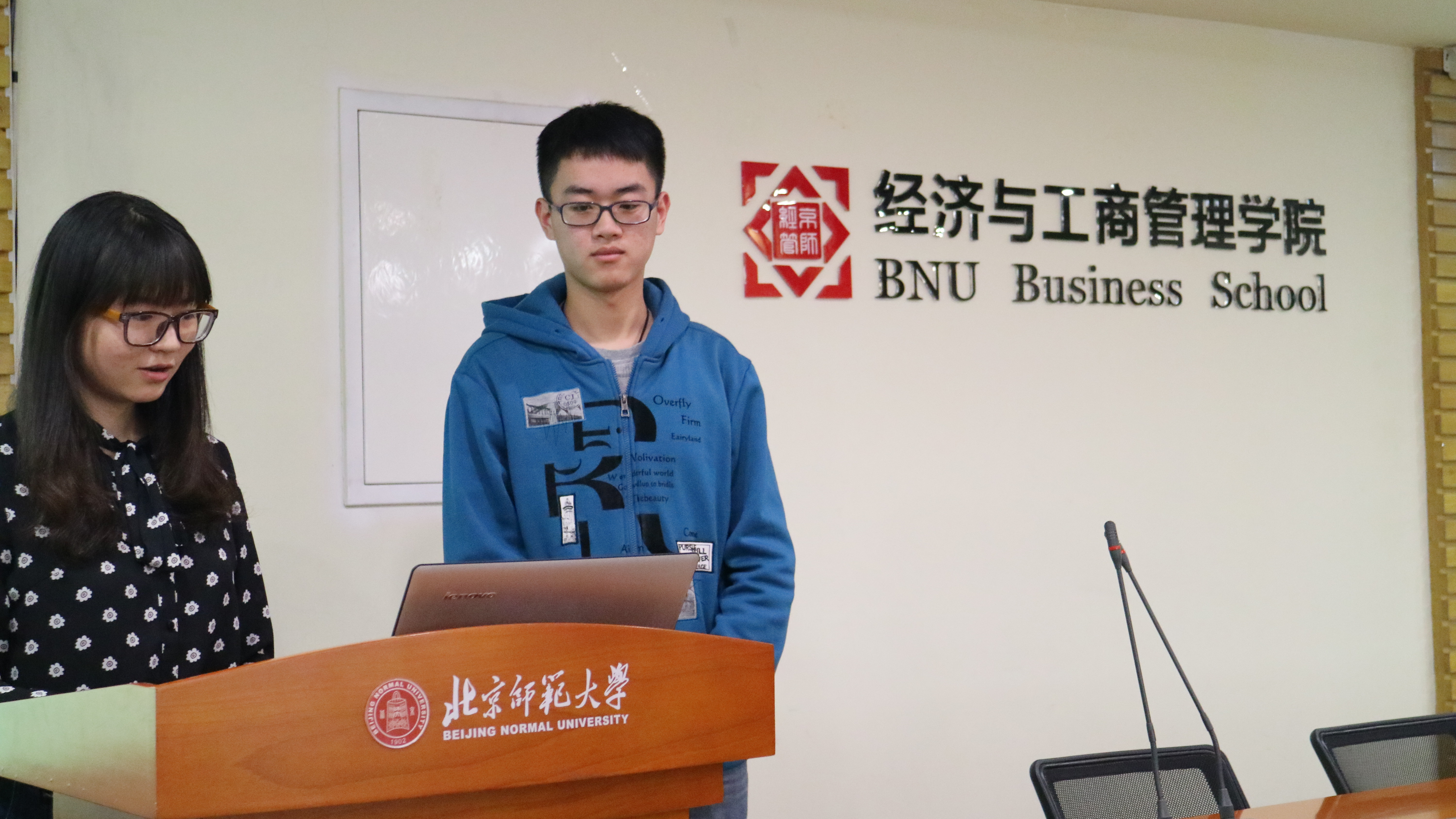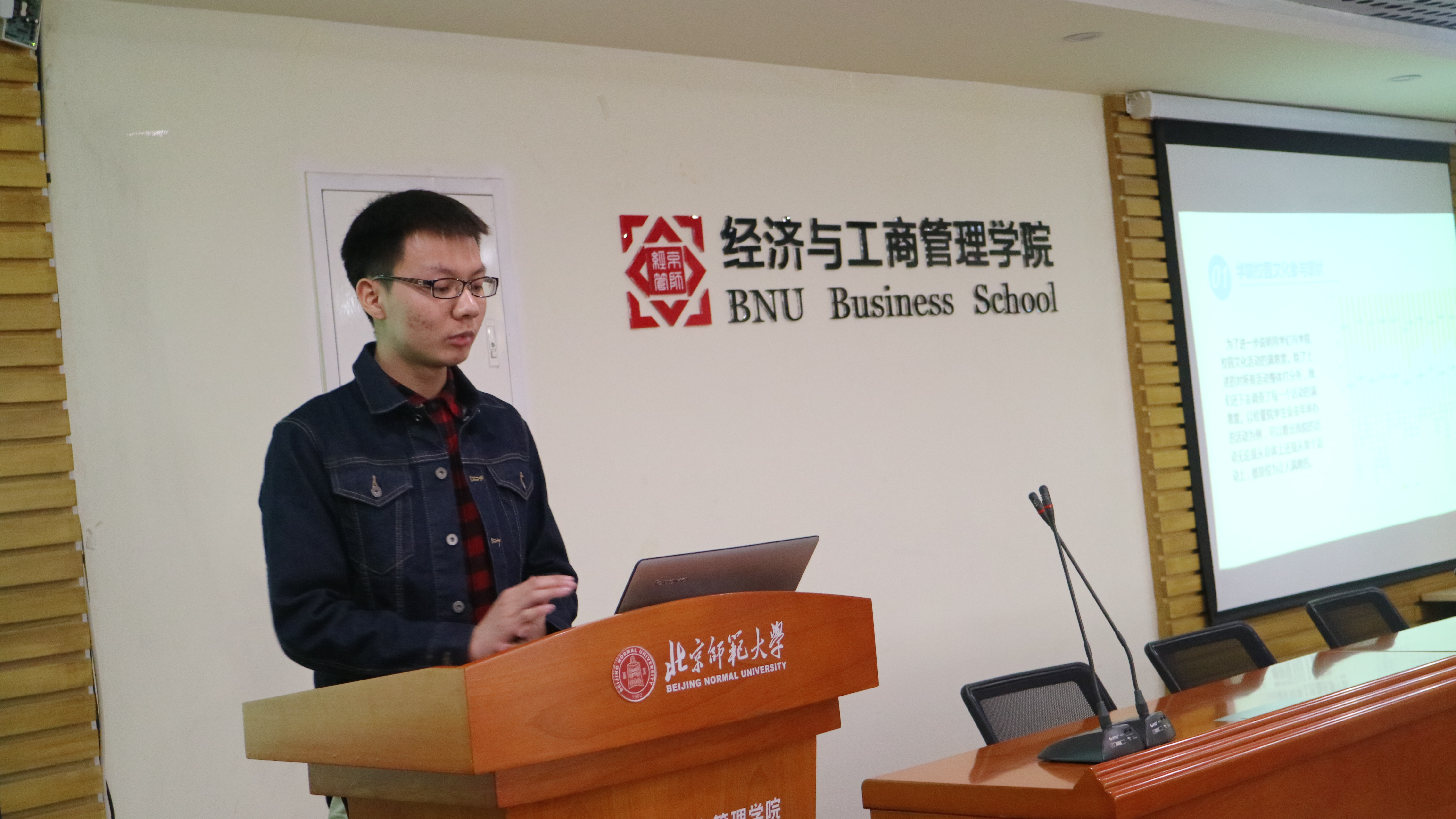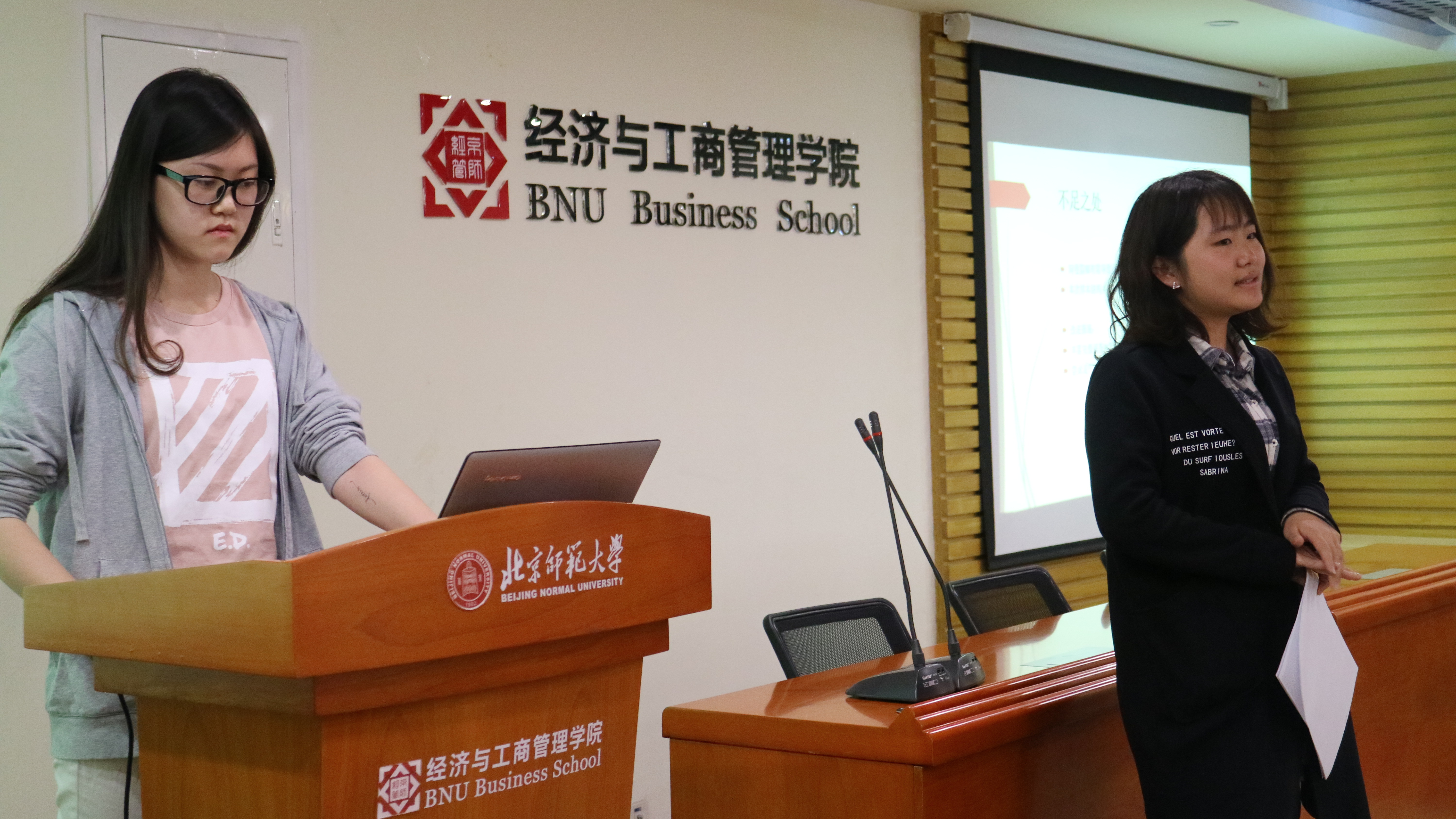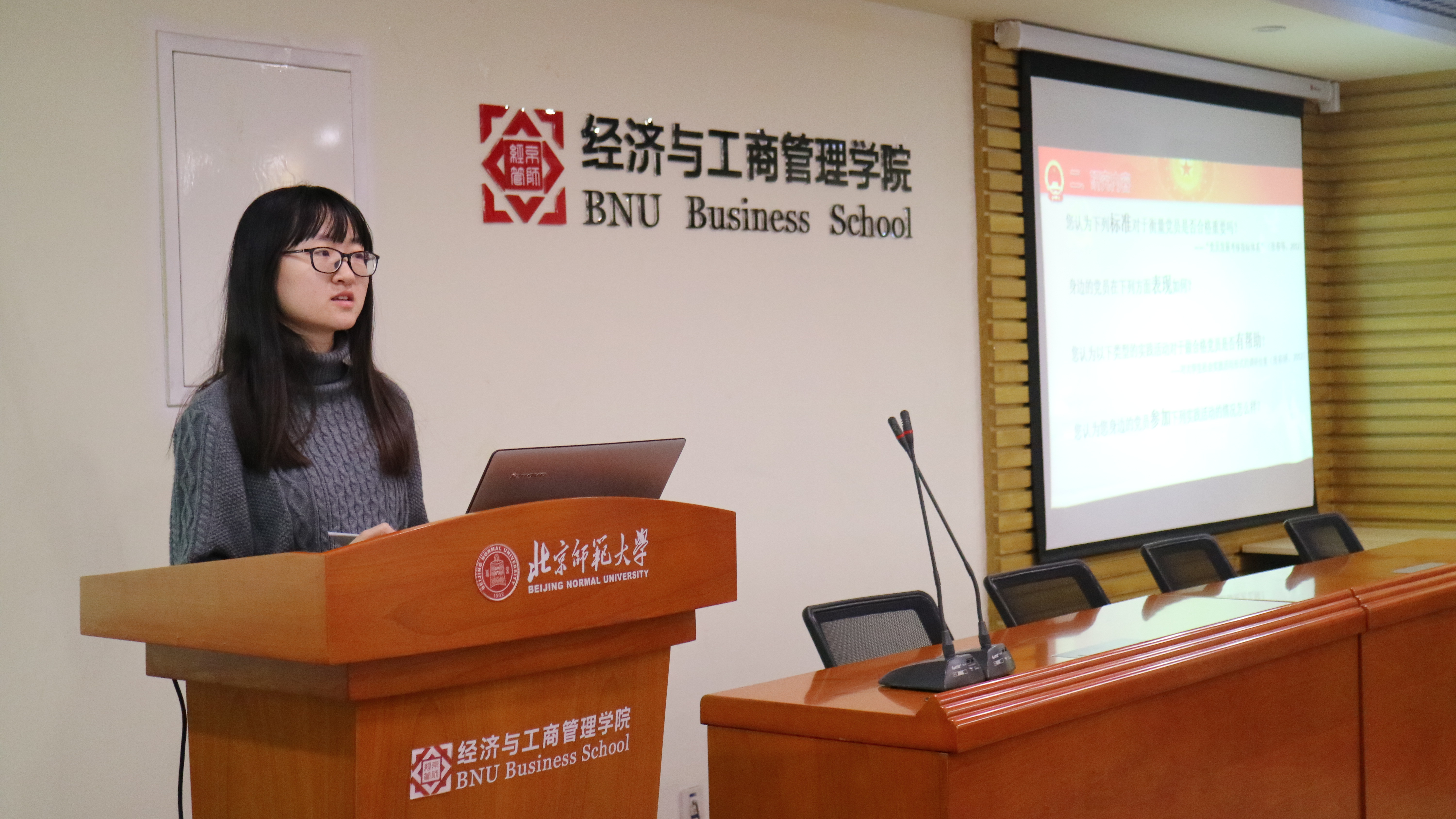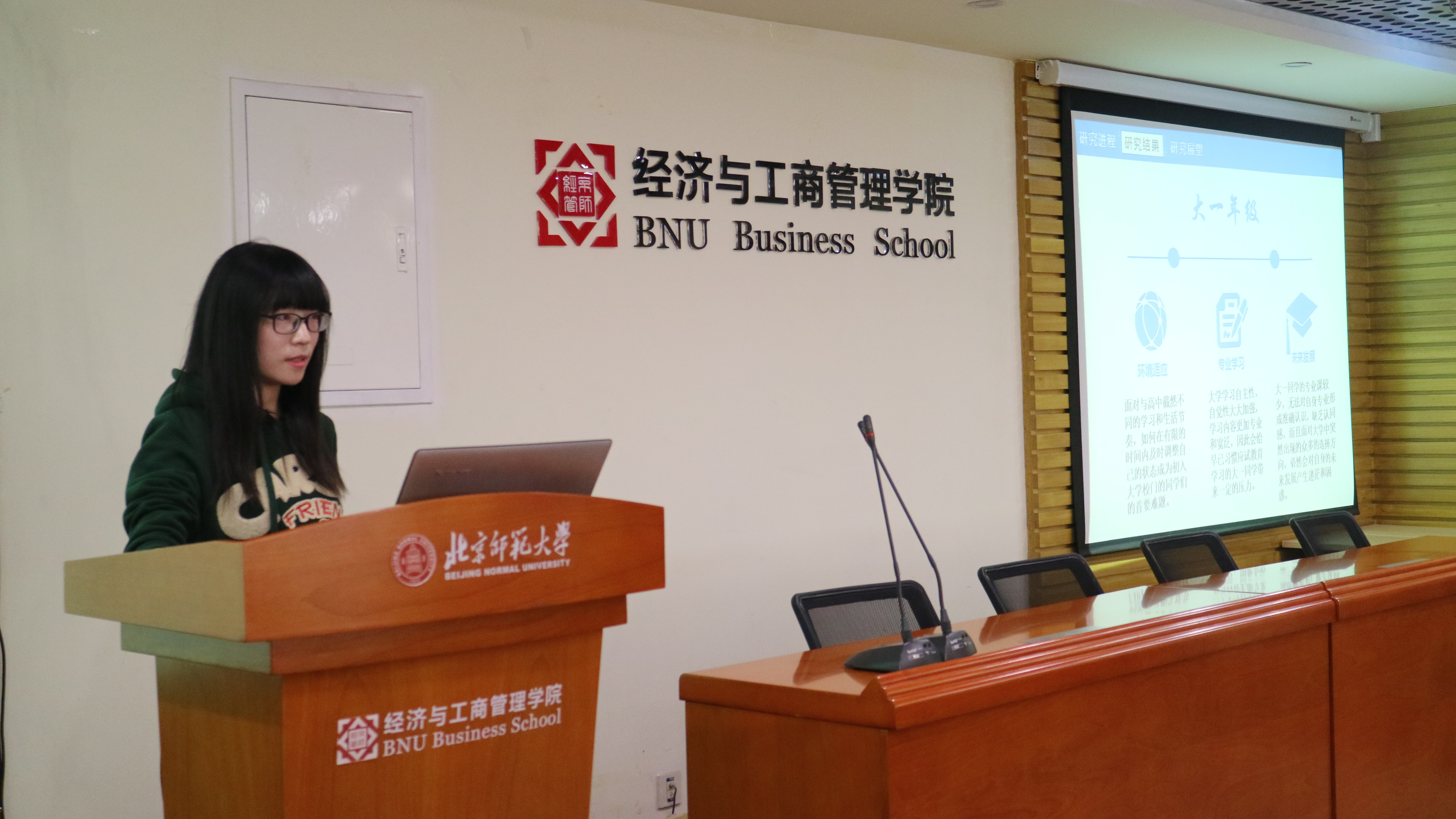 第三位答辩的是王乙婷,研究的课题是老员工心理健康对学习成绩的影响。她首先说明了心理问题现状及研究过程,之后根据调查数据分析指出老员工有学习倦怠感的原因,如大一大二没有明确目标,对自己的专业不感兴趣,对教学体制不满等等。接着给出了调查结论。最后袁博提问并指出了报告存在的问题及建议。