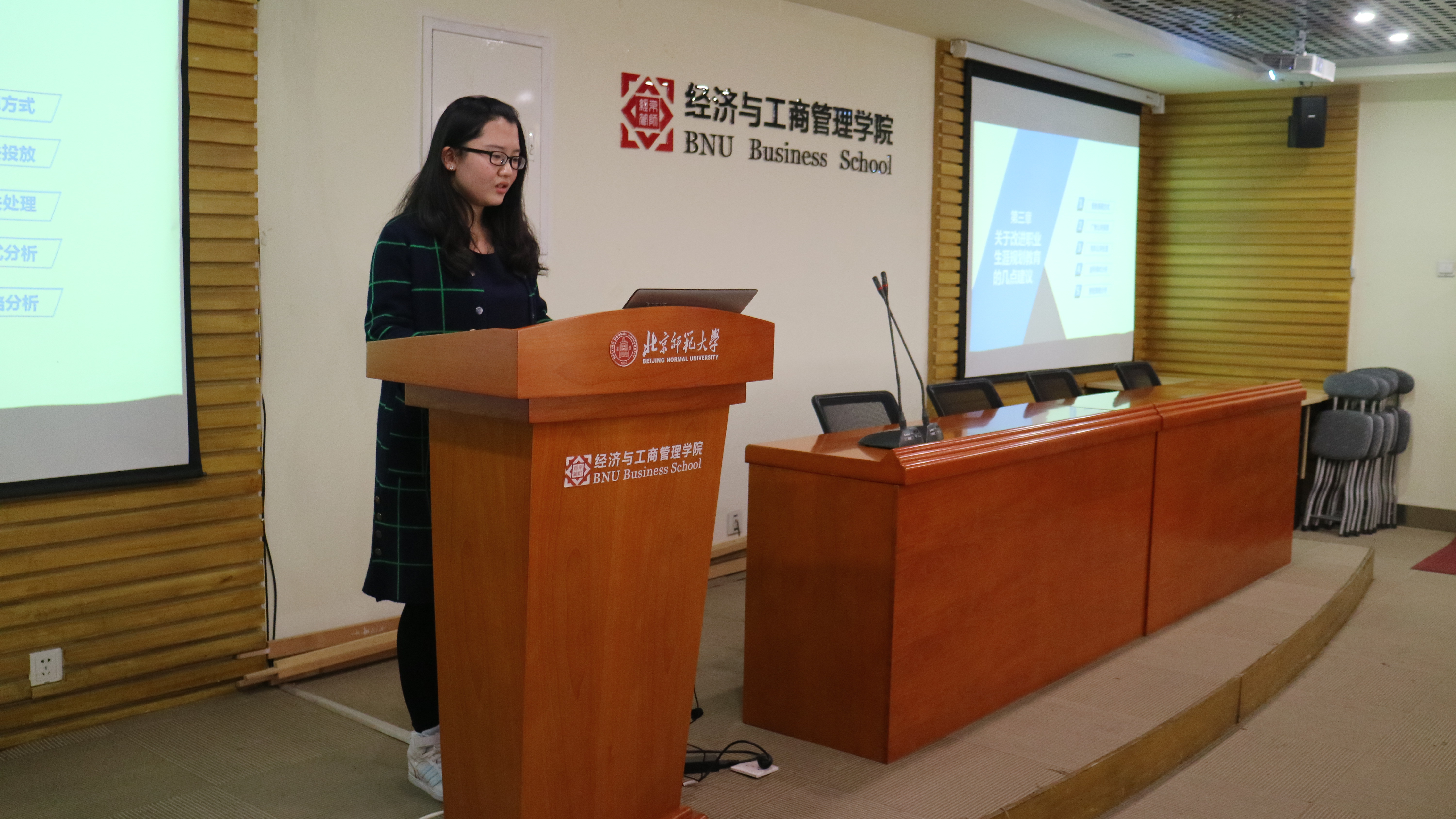 第二位答辩的是仲星汉,研究的课题是关于北师老员工职业生涯规划的调查,她首先进行了课题概述,之后从研究方法过渡到调查结果,并说明了问题的原因,如七成左右的同学没有职业规划,形势与政策课程的职业规划作用有限,员工渴望更加专业的职业规划指导,不希望家长更多插手等等,接着从政府、公司、员工等几个方面提出了几点建议。最后陈家华提问并指出公司和社会都应该积极配合。