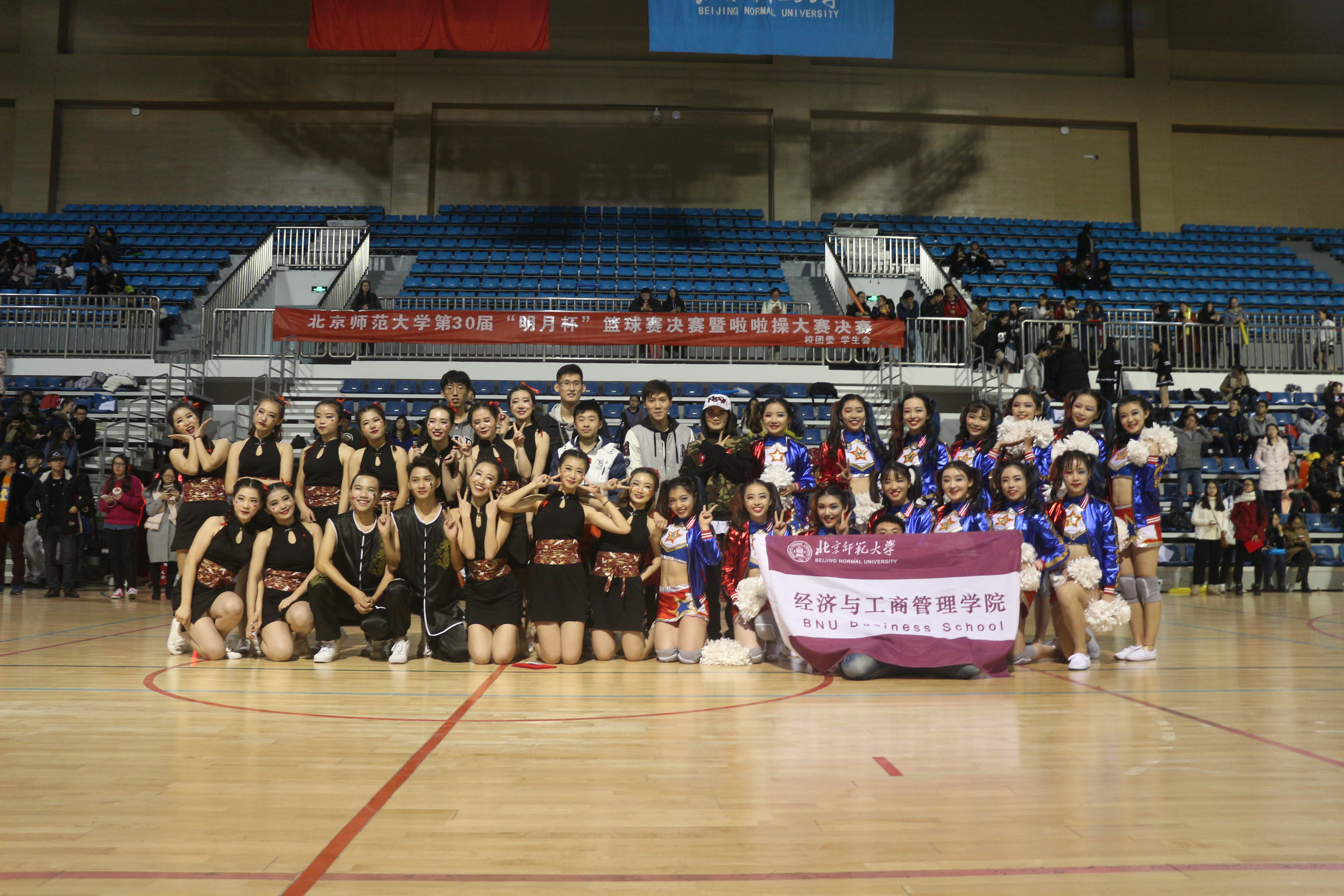 一声哨响,宣告了一场比赛的暂歇,吹响了另一场比赛的进攻号角。啦啦操团体比赛在每一节结束的短暂休息时间进行。经管啦啦操队在中场休息时第三个出场。