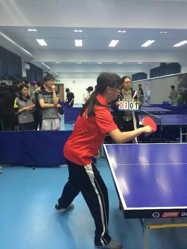 第一局是男单对决。经管的乒乓队员苏远航运球娴熟,乒乓球旋转飞舞,尽显大侠风范!只见他发力使出一招正手攻球使乒乓球飞速飞向对手,对手一时眼花缭乱,我方赢一分!接着,他看准时机,一招推挡使对手猝不及防,再赢一分!可惜,许是我方队员过于紧张,状态不佳,竟落后对手好几分。上半局以6:11收场。中场休息时,观众们围在苏远航身边,为他加油鼓劲,队员们也为他出谋划策。下半局以8:11结束,失分点主要在于打空球和下网。虽然首战失利,但苏远航不放弃任何一球的精神大大鼓舞了队友们,为他喝彩!