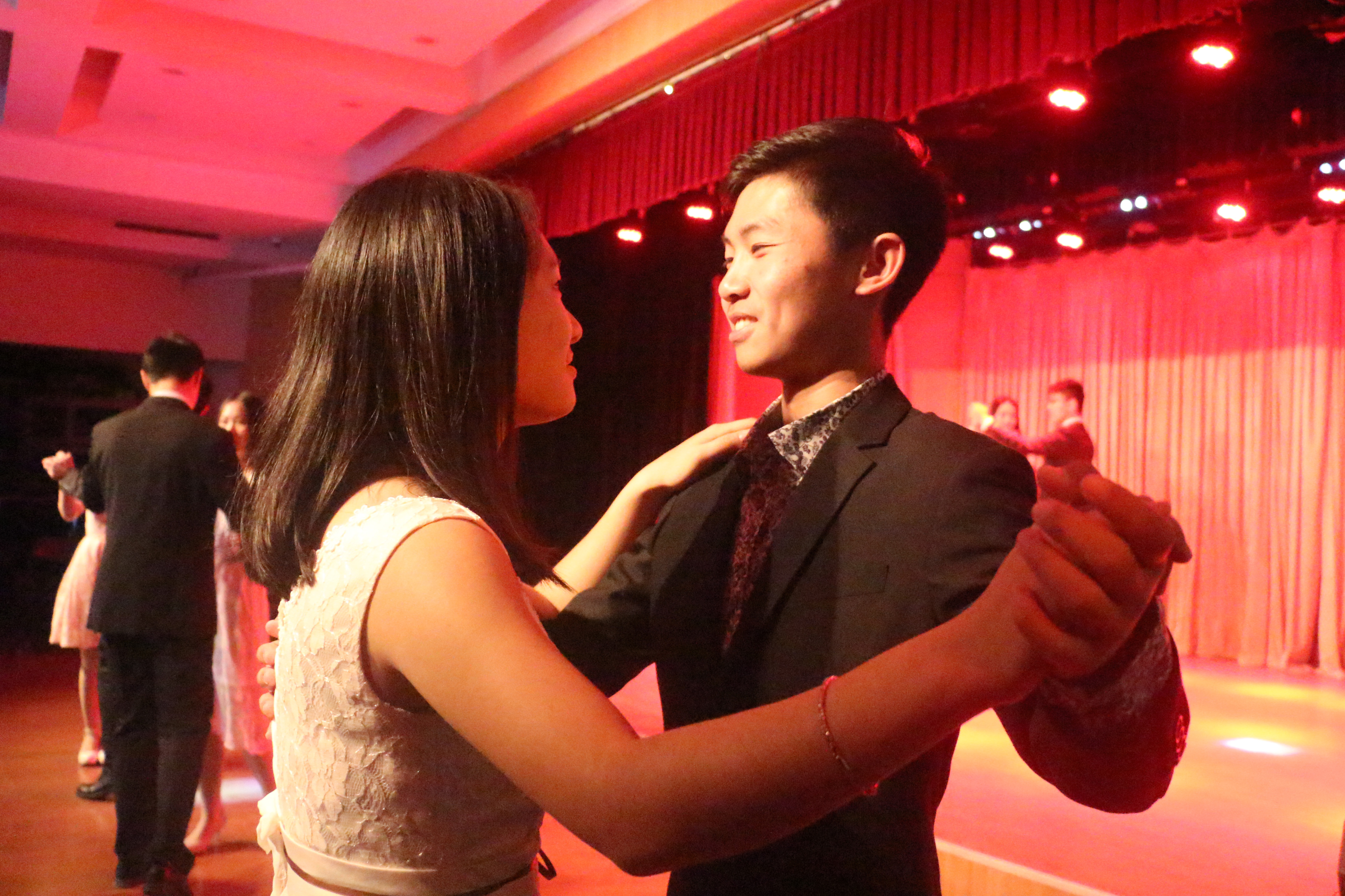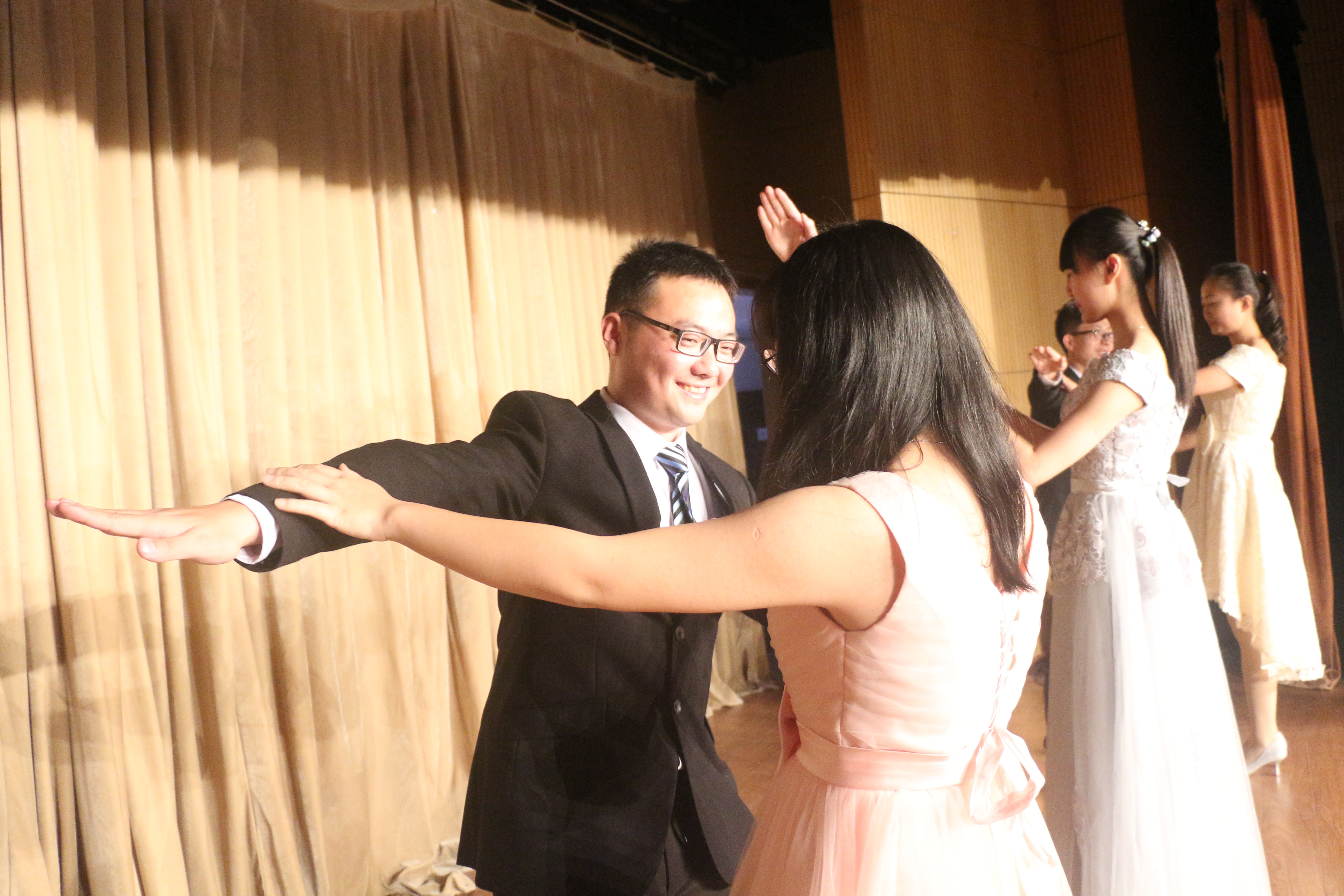 随着场内灯光转为绚烂的紫色,舞会正式开始。首先播放了北航同学亲手制作的小视频,接着,就是第一支舞。在悠扬的旋律中,男女搭档在摸索中逐渐熟悉,在交流中加深默契,一曲终了,大家都觉得意犹未尽。