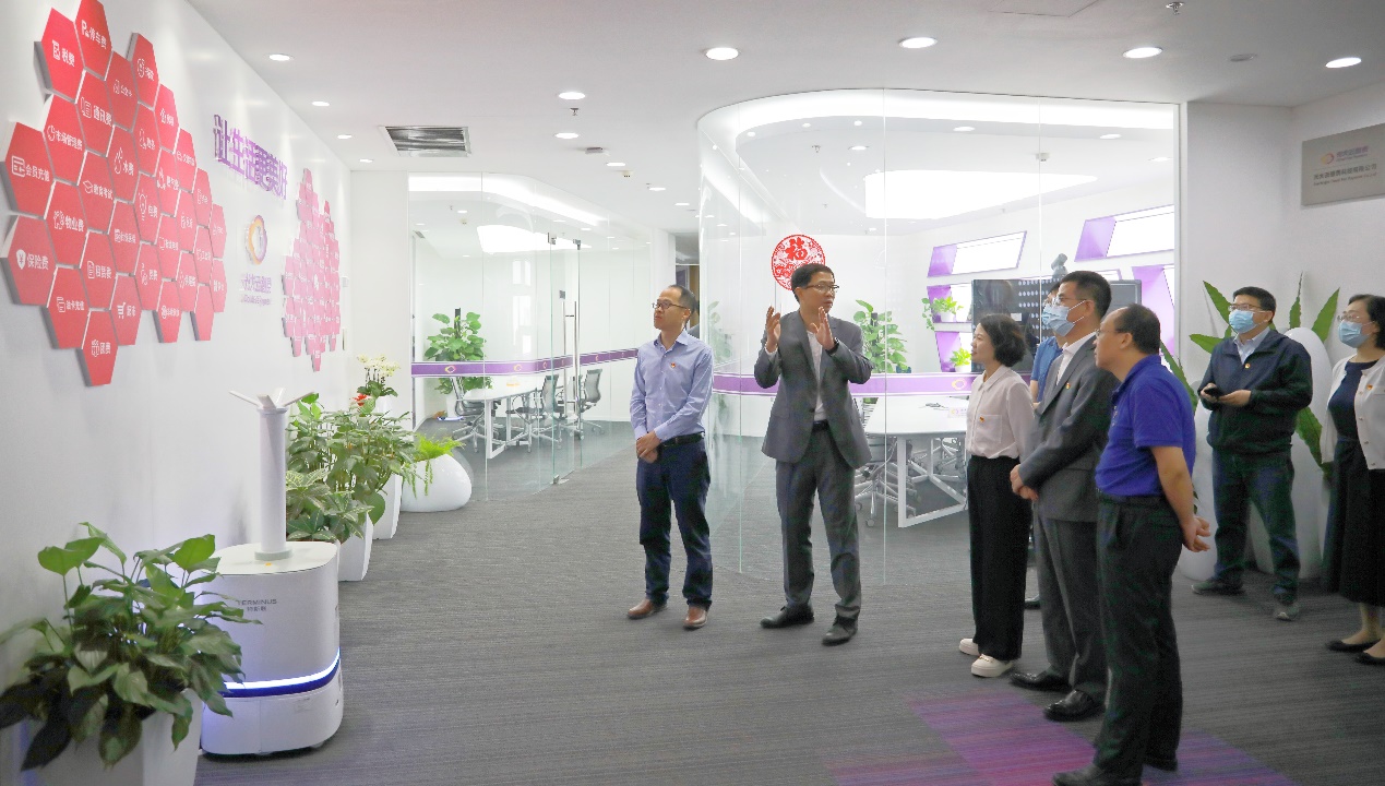 光大云缴费樊效峰副总经理引导参观光大云缴费科技有限公司的办公区,简要介绍了光大云缴费的发展历程、核心业务和竞争优势,并转达了许长智董事长对公司一行到访的欢迎。孙志军书记首先感谢光大云缴费提供这次调研参访的机会,既是深入学习贯彻习近平新时代中国特色社会主义思想主题教育,也是推进熟悉企业、增进校企合作,促进人才培养和员工就业。