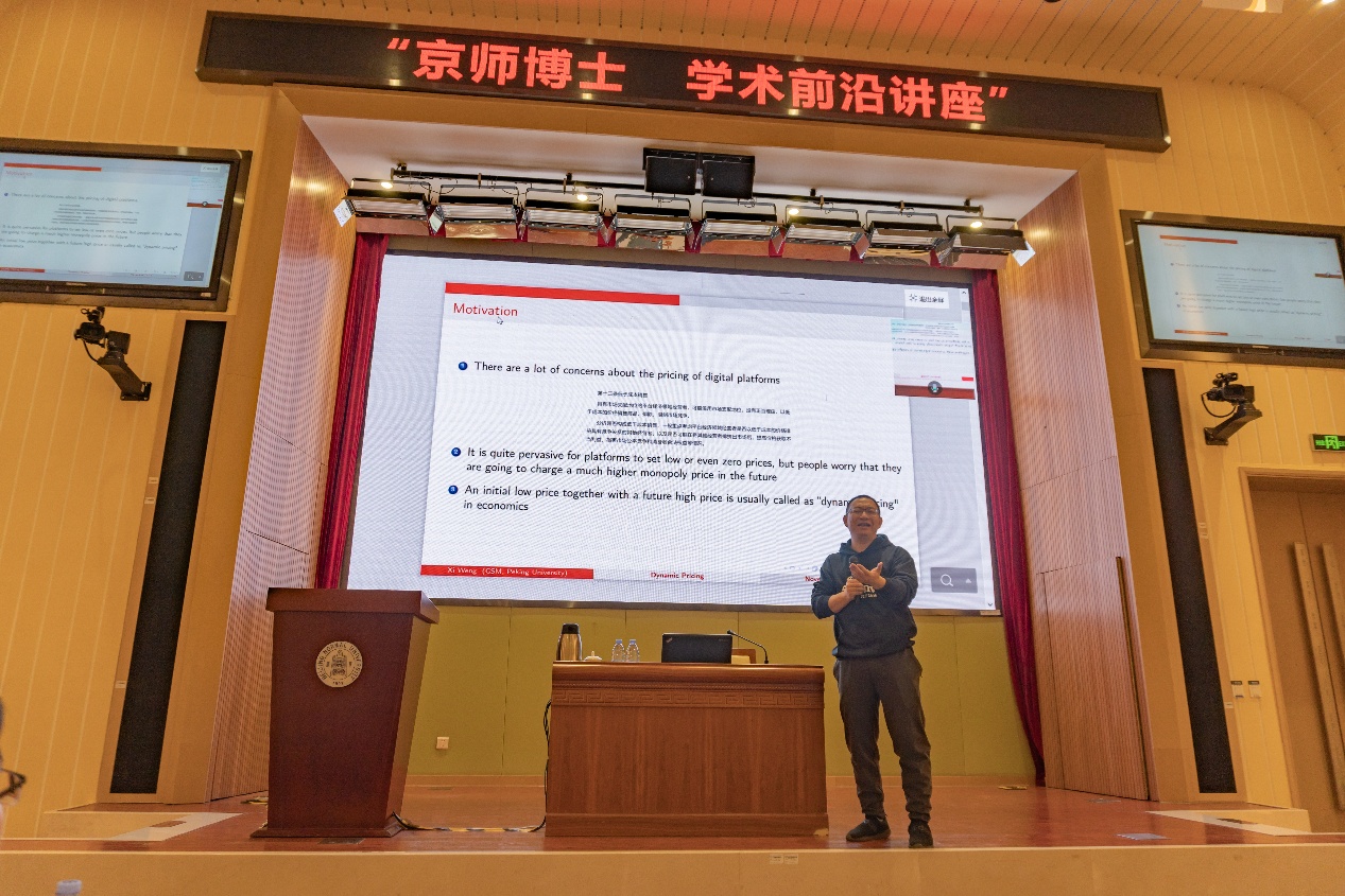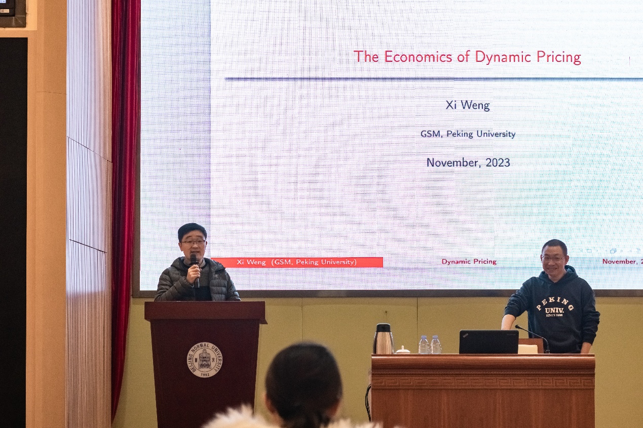 本次报告主题是《动态定价的经济学理论》,翁翕教授首先从数字平台动态定价的现象出发,对经济学中存在的多种理论解释进行阐释,并引出动态学习的理论框架。随后以“赌博机问题”(Bandit Problems)为例,详细展示了动态学习在经济决策中的重要性,并通过一个简单的理论模型讨论了不同市场结构下企业应对动态学习的定价策略。最后,翁翕教授结合自己最新的合作论文拓展讨论了在考虑信息收集成本情况下的动态定价和促销激励策略。