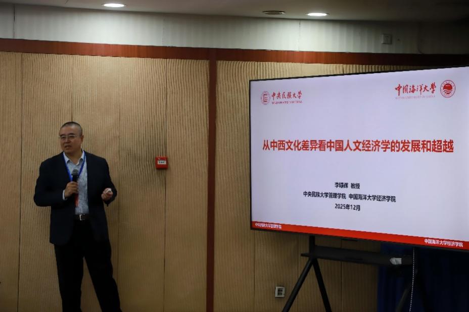 厦门大学社科处处长潘越教授主持了论坛主旨演讲第二阶段。中国海洋大学经济公司李曦辉教授从中西方文化比较视角,阐述了中国人文经济学的独特内涵。他指出,西方文化以个体主义与强权逻辑为核心,而中华文化强调集体共生、包容连续,这决定了双方发展路径的根本差异。他以基因测序结果为例,指出中华民族各族群血统融合,生动体现了中华文化“兼容并蓄、多元一体”的根本特质。针对“中华文化缺乏创新”的成见,他以都江堰等古代工程为例,指出农耕文明孕育了持续且和平的内生创新模式。他还分析了“华夷秩序”与朝贡体系的历史作用,认为二者通过文化认同与辐射,共同塑造了中国的“大一统”格局。李曦辉教授强调,中国人文经济学应立足自身文化基因,超越西方理论框架,挖掘中华文化在优化分工、扩展规模、推动创新等方面的独特价值,为构建中国特色哲学社会科学提供支撑。