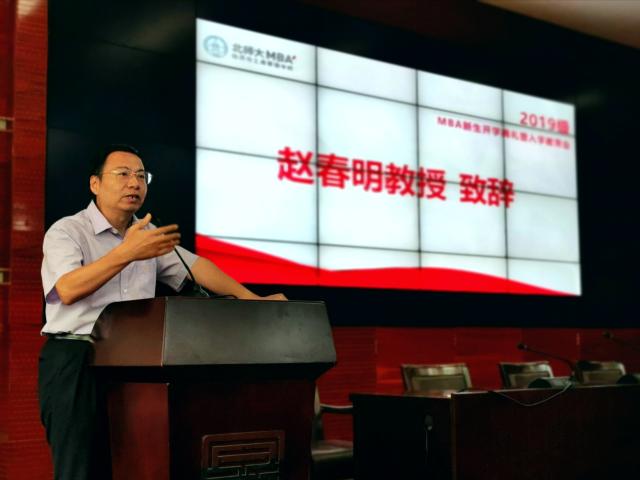 赵春明教授作为教师代表致辞。赵老师用自己的亲身经历鼓励大家,在这样一个好的时代,要通过自身的不断努力,再攀高峰。他对2019新生提出了期望,希望大家能够平衡好学习和工作的关系、课堂和课下的关系以及物质和精神的关系。