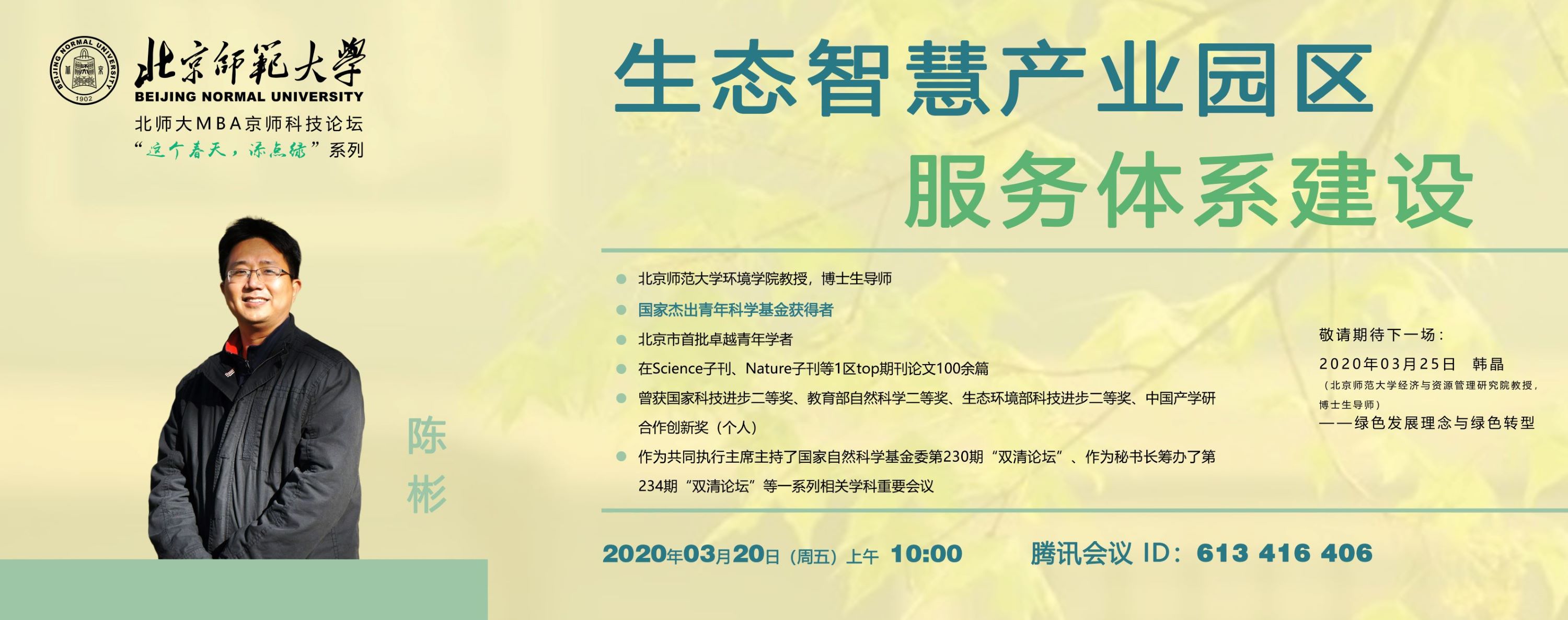 2020年3月20日,正值春分时节,北师大MBA中心“这个春天,添点绿”主题系列讲座开展了第二讲——“生态智慧产业园区服务体系建设”。主讲嘉宾是永利集团环境公司教授、博士生导师陈彬。陈教授是国家杰出青年科学基金获得者,北京市首批卓越青年学者,在Science子刊、Nature子刊等1区top期刊论文100余篇,曾获国家科技进步二等奖等诸多奖项。