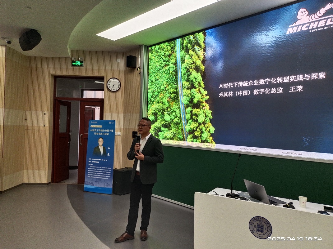 2025年4月19日晚,yl88858永利集团“数字经济与管理大讲堂”第42讲《AI时代下传统企业数字化转型探索与实践》在电子楼阶梯教室举办。本次讲座特邀米其林中国数字化转型总监王荣主讲。MBA教育中心主任周江华主持讲座,150余位公司本、硕、博员工到场聆听。