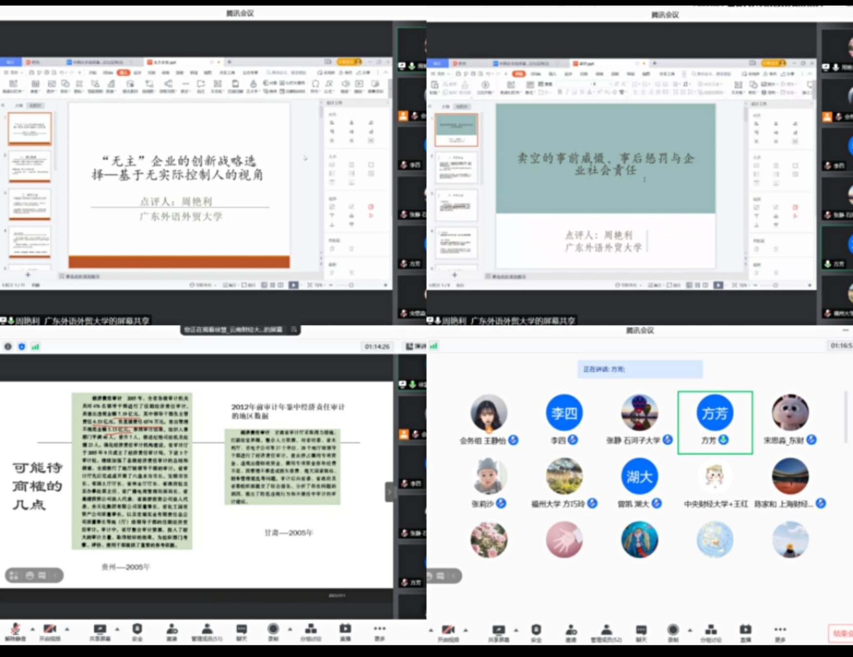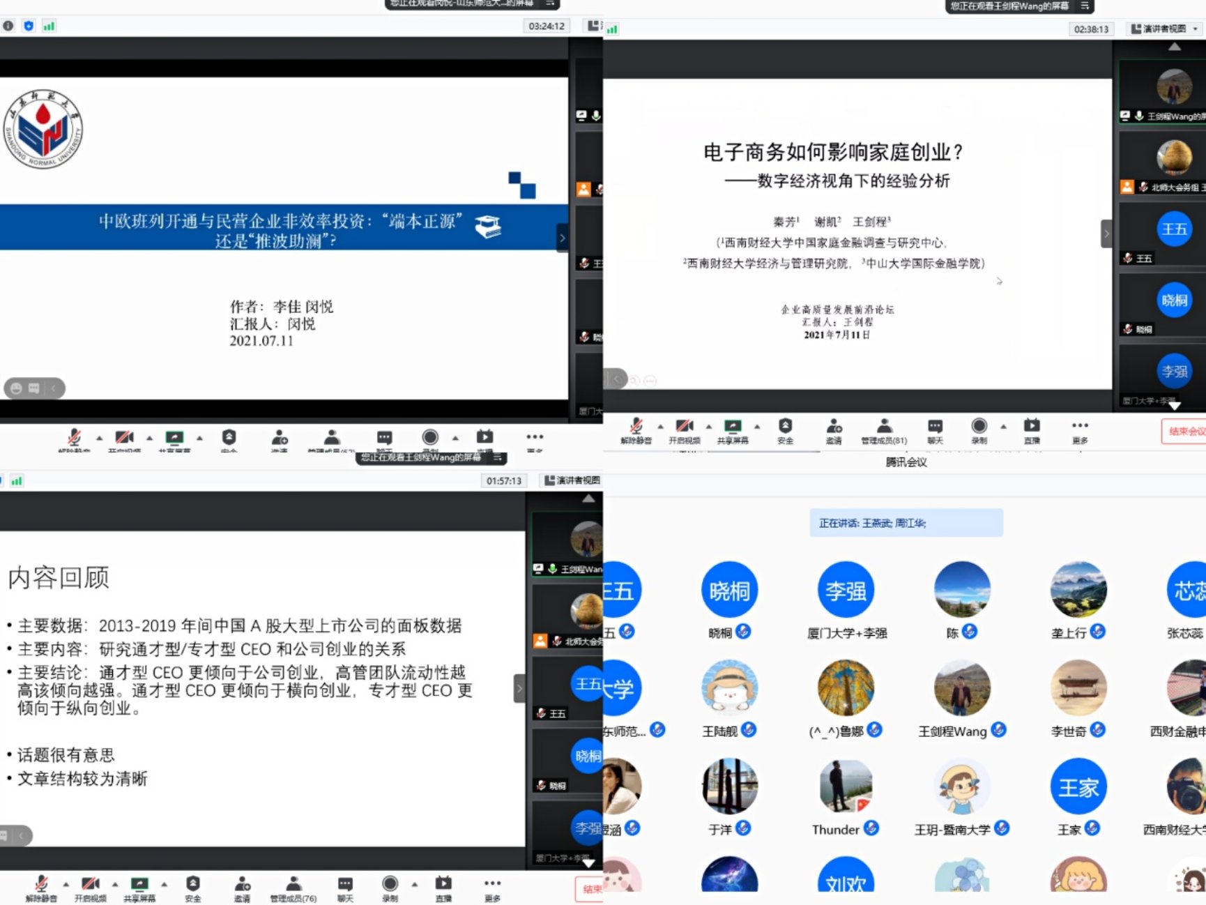 下午,会议进入分论坛研讨环节,分为2个线下分论坛和3个线上分论坛同步进行。其中,2个线下分论坛分别由《中国工业经济》杂志社李鹏、yl88858永利集团童璐琼主持,3个线上分论坛分别由yl88858永利集团郑飞虎、方芳和周江华主持。入选论文的作者详细展示了研究成果,各个分论坛均邀请了相关领域的专家学者逐一进行点评,“中国企业高质量发展前沿论坛”在大家热烈的讨论和思想碰撞中顺利结束。