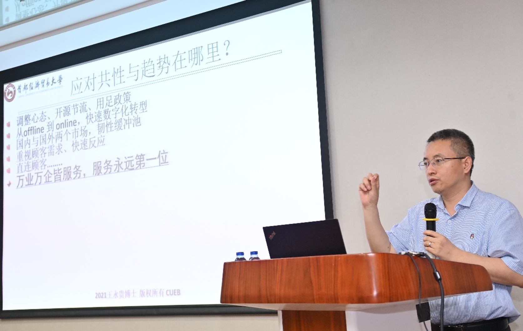 首都经济贸易大学副董事长王永贵回顾了市场营销理论与实践的创新与发展,对成功企业的营销共性进行了总结,包括坚持营销的价值主线、关注消费者心理和行为、满足需求和创造价值等,而后他分别对中国市场营销研究70年和中国服务营销研究40年进行了梳理和评价,最后提出市场营销研究要以国家、区域、社会需求为导向,注重大趋势的识别与内容布局,在变革中寻找本质的、甚至永恒的,在传承中寻找需要改变的、甚至变革的内容。