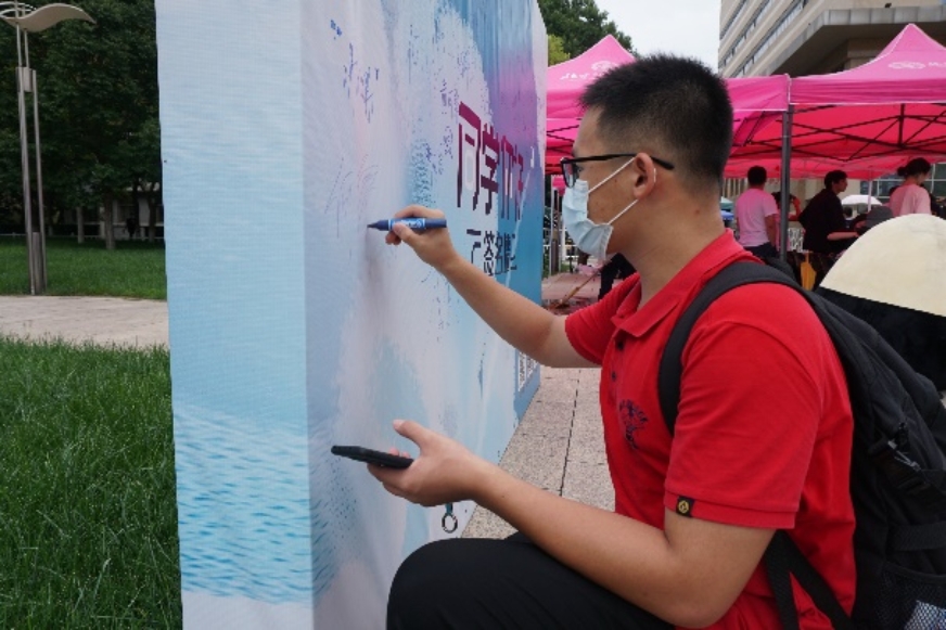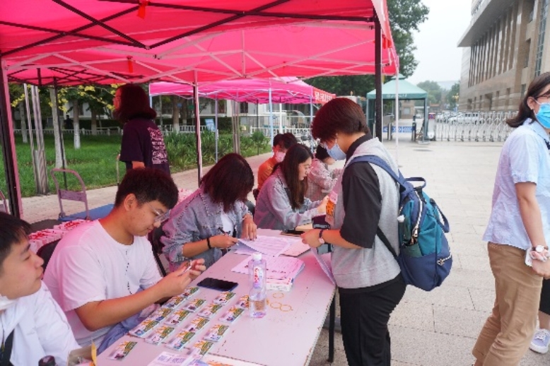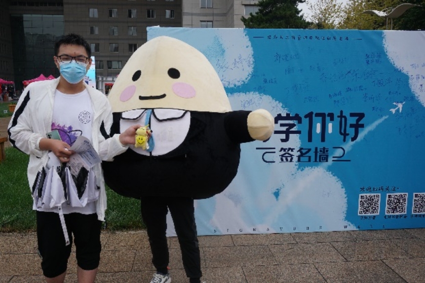 因校园防疫要求,家长无法陪同新生们进入校园,所以同学们在志愿者的引导下独自办理新生入学手续。迎新点依次为签到注册、材料分发等步骤,并且为各位新生准备了抽奖活动和签名拍照留念。迎新活动在工作人员及志愿者的引导下,有条不紊地进展着。