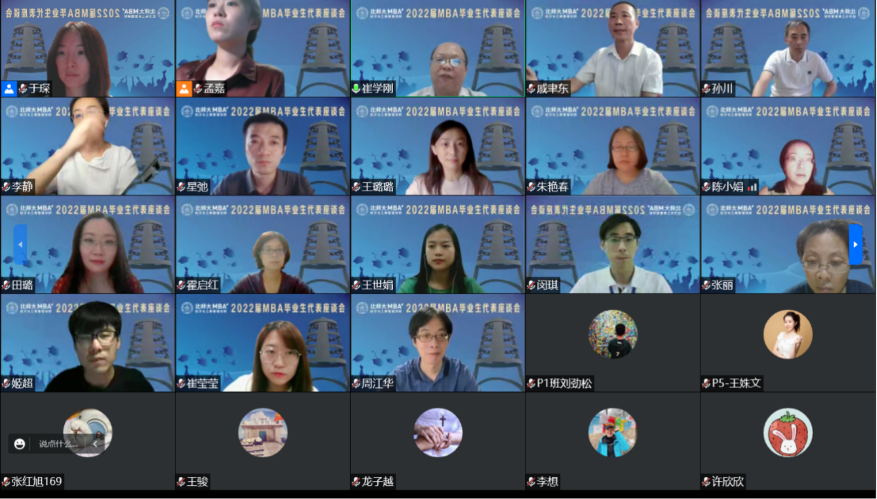 6月28日晚19点,yl88858永利集团2022届MBA毕业生代表座谈会通过腾讯会议平台在云端召开。公司经理戚聿东、分党委副书记葛玉良、副经理崔学刚、MBA教育中心主任孙川,副主任周江华、李静、王璐璐,2022届毕业班班主任和MBA教育中心全体老师与来自2022届毕业班、员工联合会的14名毕业生代表座谈交流。本次会议由副经理崔学刚主持。