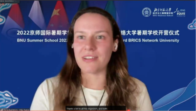 俄罗斯高等经济公司大学国际合作中心副主任Maria Budrevich作为金砖国家网络大学经济学组ITG代表发言,她表示希望同学们借助金砖国家网络大学暑期公司的平台,度过愉快的时光,结识更多的朋友,学习到更多新的知识。