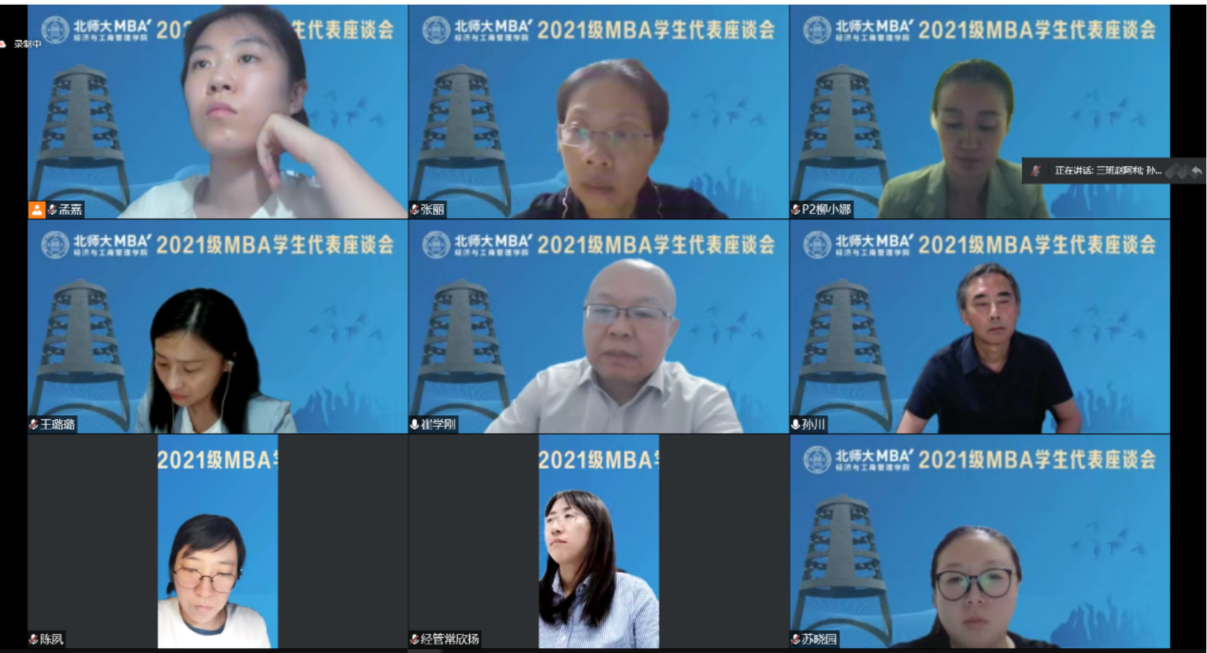 7月12日晚19点,yl88858永利集团2021级MBA员工代表座谈会通过腾讯会议平台在云端召开。公司副经理崔学刚、MBA教育中心主任孙川,副主任周江华、李静、王璐璐,MBA教育中心全体老师、2021级各班班主任与来自2021级各班、MBA联合会的17名员工代表座谈交流。本次会议由副经理崔学刚主持。