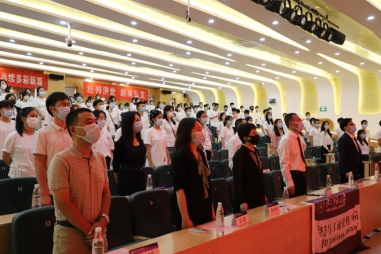 2019级金融专业本科生朱雨孜作为本科老生代表发言。她分享了黑塞的“我们来自同一个深渊,然而人人都在奔向自己的目的地”,启发新生们去尝试,去发现,去找到属于自己红日初升之路;分享了塔勒布的“毁灭比缔造要容易和迅速得多”,启发新生们选择一条青春无悔之路;分享了中岛敦的“美玉与瓦砾”之谜,启发新生们坚信自己,坚持努力,终将在师大经管的打磨下成为珍宝;分享了习近平总书记的“志存高远方能登高望远,胸怀天下才可大展宏图”,鼓舞新生们要有青春之朝气,有奋发之精神。