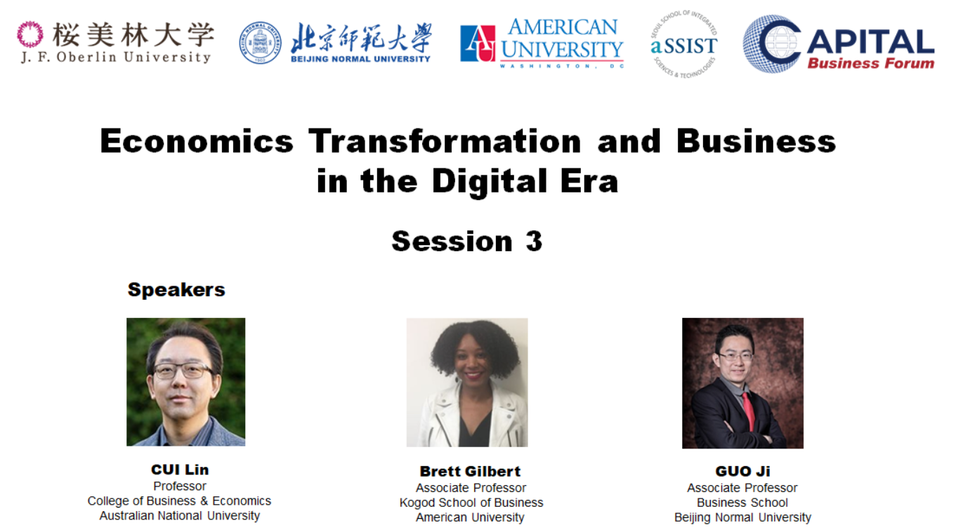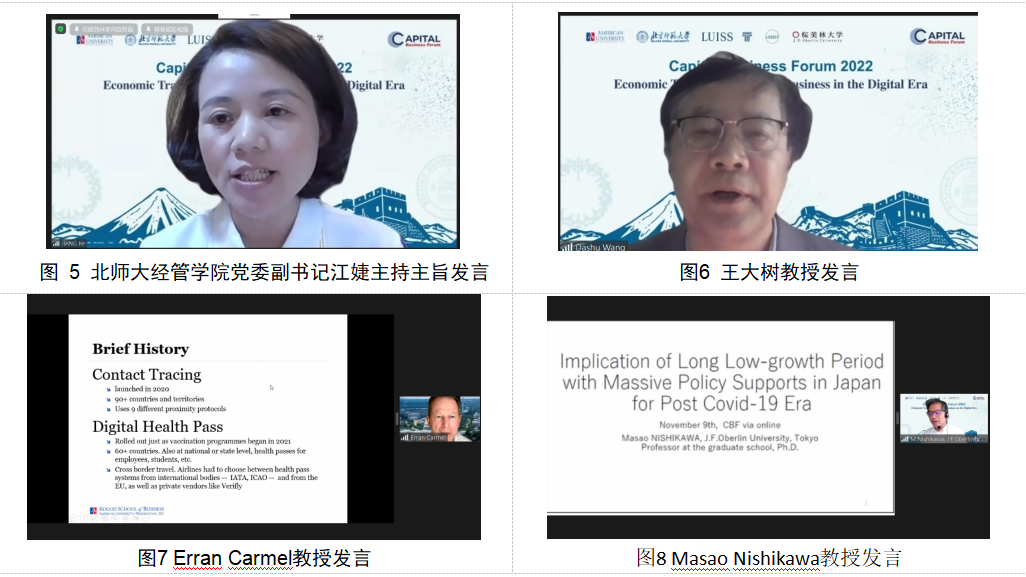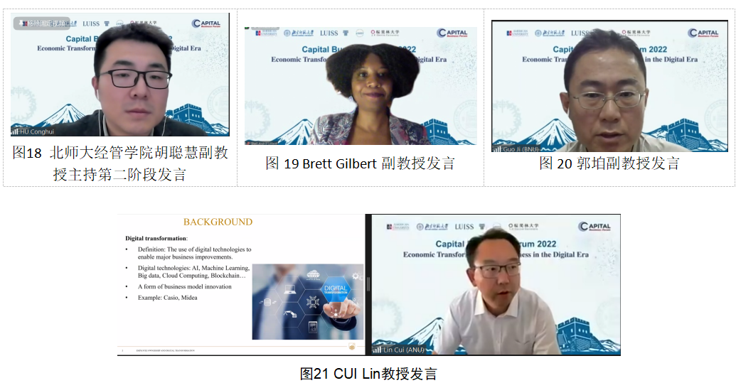 第一阶段主旨发言由北师大公司党委副书记江婕主持。Masao Nishikawa以“Implication of Long Low-growth Period with Massive Policy Supports in Japan for Post Covid-19 Era”为题,结合自己逾30年在日本内阁府的工作经历和学术研究,指出面对疫情后长期经济的低增长,政府应该保持政策扶持和弹性,帮助社会恢复活力。Erran Carmel教授以“Pandemic Megasystems: A New Framing and Lessons from Failures”为题梳理了全球90余个国家面对新冠疫情的应当方案和做法,总结经验与教训,提出期望构建全球防疫新框架。王大树教授以“Increase the Non-contact Elements, Develop Beijing's Digital Economy”为题结合北京的防疫实践,建议推进首都经济无接触元素的拓展,以数字经济缓解和应对疫情带来的冲击。龚诗阳副教授进行了“Powering Consuming Insights in a Digital World”的演讲,分享了在数字经济时代如何促进消费理念转变的研究成果和观点。