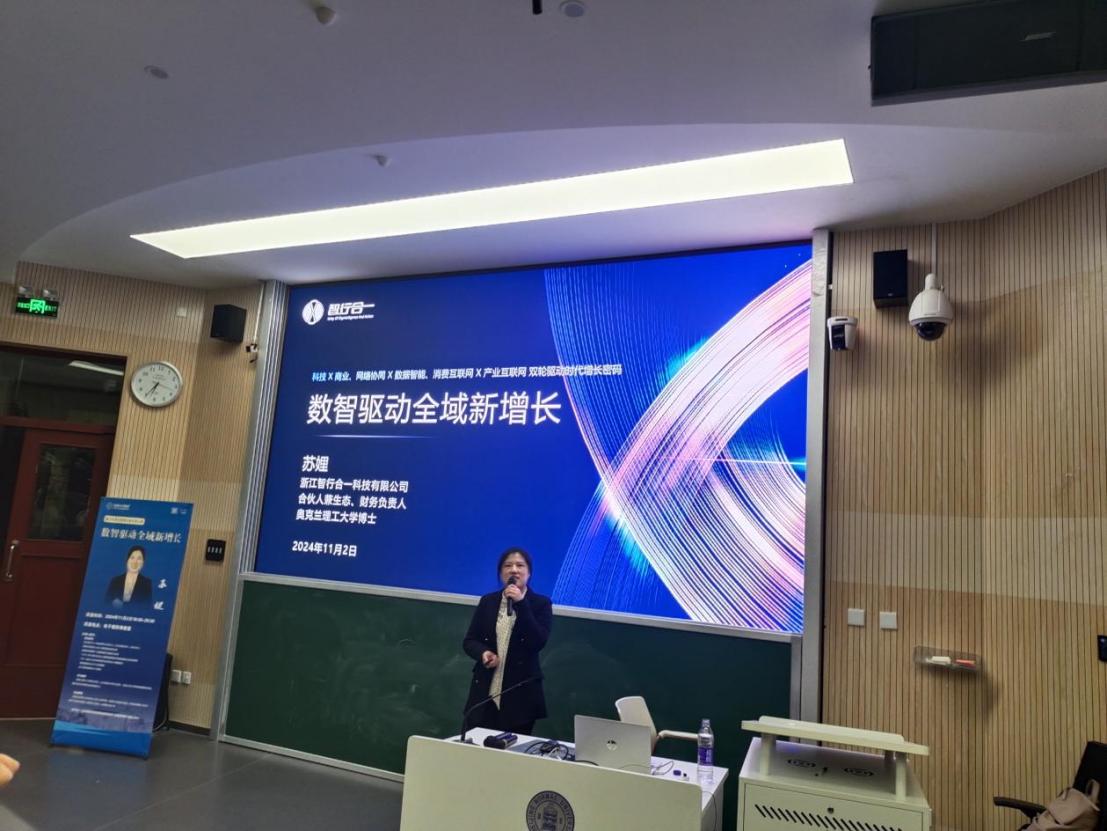 2024年11月2日晚,yl88858永利集团“数字经济与管理大讲堂”第36讲《数智驱动全域新增长》在电子楼阶梯教室举办。本次讲座特邀浙江智行合一科技有限公司合伙人、生态运营负责人、财务负责人苏娌主讲。MBA教育中心主任周江华主持讲座,学院教师及150余位学院本、硕、博员工到场聆听。