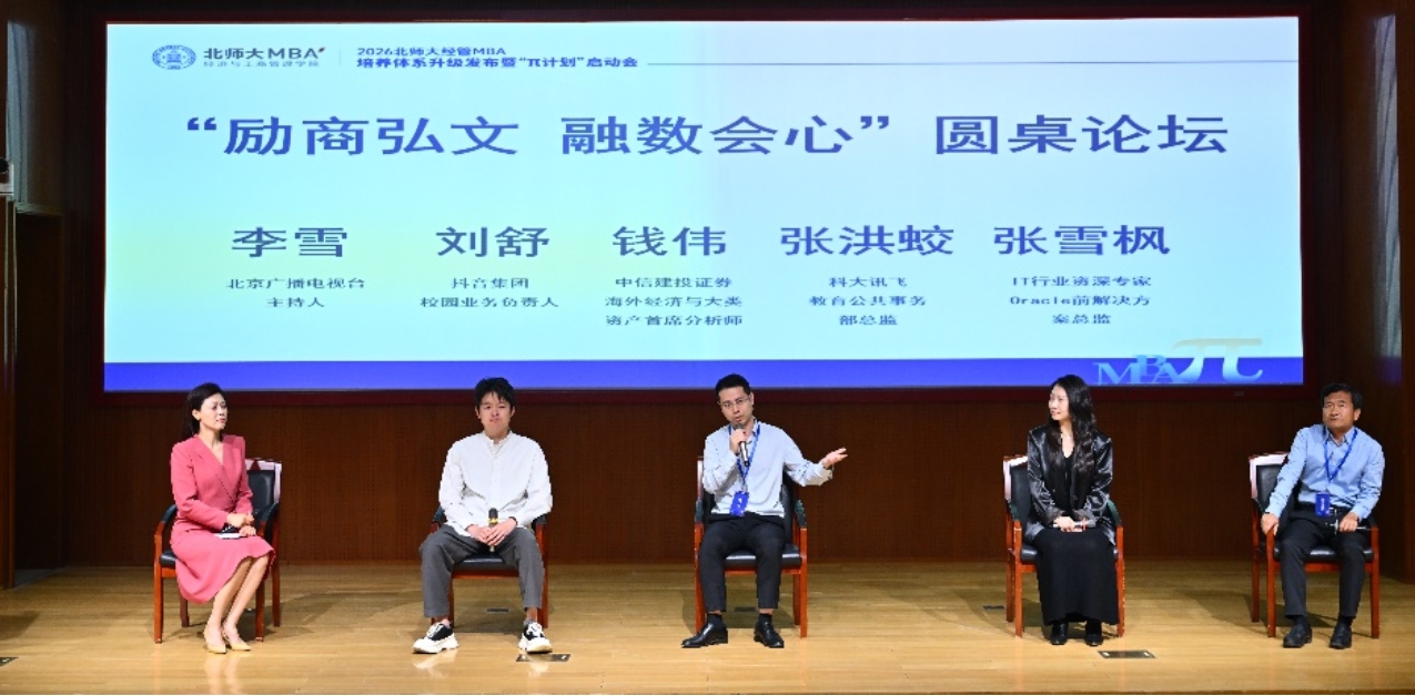 此次“励商弘文 融数会心”圆桌论坛由北师大MBA2024级在校生、北京广播电视台主持人李雪主持。论坛特别邀请了抖音集团校园业务负责人刘舒、中信建投证券海外经济与大类资产首席分析师钱伟、科大讯飞股份有限公司教育公共事务部总监张洪蛟以及IT行业资深专家、Oracle前解决方案总监张雪枫四位业界精英。论坛围绕“数智时代的产业发展与人才成长”和“基于商业场景的校企共育商科人才模式”两大议题展开深入讨论,嘉宾们分享了各自领域的见解与经验,为商科人才的培养提供了宝贵思路。