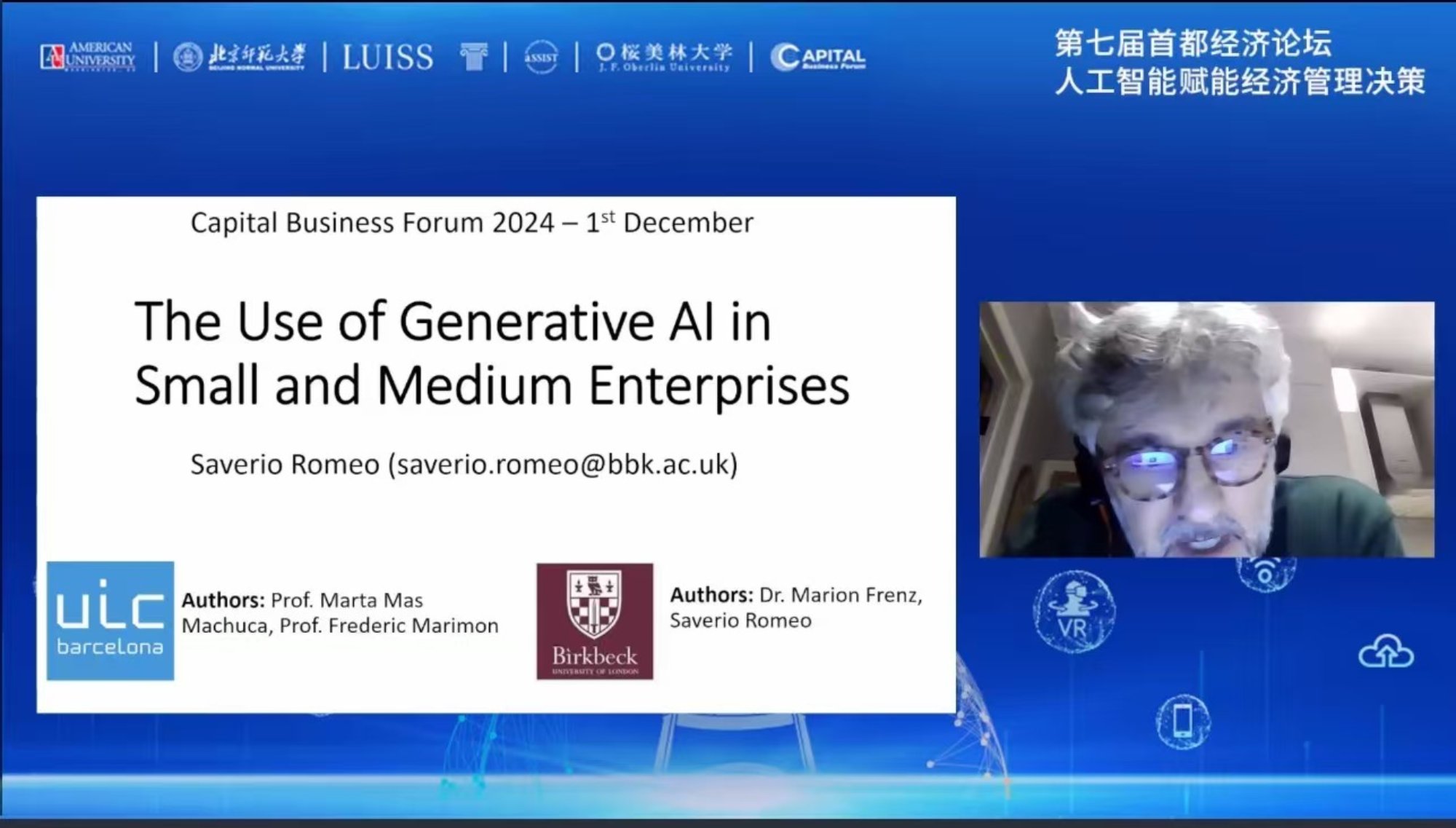 伦敦大学贝克公司高级讲师萨维里奥·罗密欧以“The Use of Generative AI in Small Businesses”为题,从研究背景、样本描述与分析,以及结论等几方面展开讨论。他指出,生成式人工智能工具已经成为日常工作生活中的一部分,生成式人工智能的应用使得员工的绩效得到了改善。