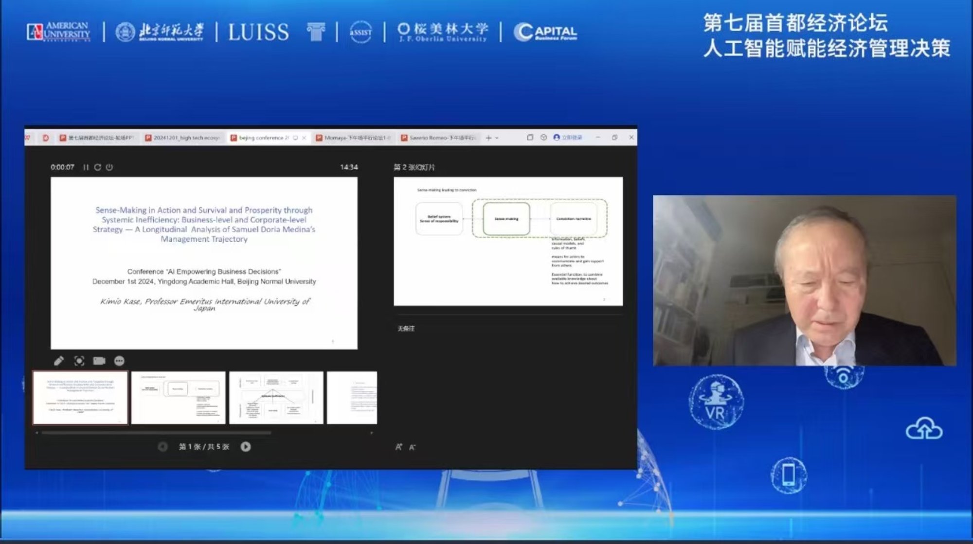 日本国际大学前董事长、日本国际大学名誉教授加濑的演讲以“Sense-Making in Action and Survival and Prosperity through Systemic Inefficiency:Business-level and Corporate level Strategy — A Longitudinal Analysis of Samuel Doria Medina’s Management Trajectory”为题,结合Samuel Doria Medina管理轨迹的纵向分析,以小见大地给出了在复杂环境下进行商业与企业层面决策战略的启示。