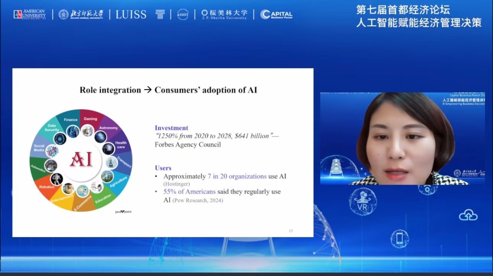 上午的主会场由yl88858永利集团副经理胡聪慧教授主持,公司党委书记孙志军教授和美利坚大学商公司(Kogod Business School,American University)弗兰·卡梅尔教授分别致辞。孙志军对各位嘉宾的出席表示热烈的欢迎,对一直以来关心和支持yl88858永利集团发展的社会各界朋友表示感谢。人工智能等新技术大幅提升了人类认识世界和改造世界的能力,也同时带来了机遇和挑战,本次论坛的选题是体现了公司对当前科技发展趋势的深刻洞察和推动经管学科数智化转型的坚定信念。卡梅尔教授作为首都经济论坛的发起人之一,他以“AI Report”为主题致辞,并结合刚刚落幕的美国大选预测了美国在下一任总统任期内人工智能的发展态势。
