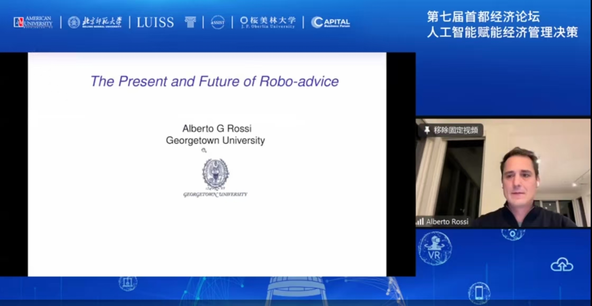 美国乔治城大学科罗拉多商公司金融学教授阿尔贝托·罗西以“The Present and Future of Robo-advice”为题,围绕着机器人投资顾问的过去、现在、未来,以及高级分析技术怎样解决金融领域以及决策过程当中的问题而展开。