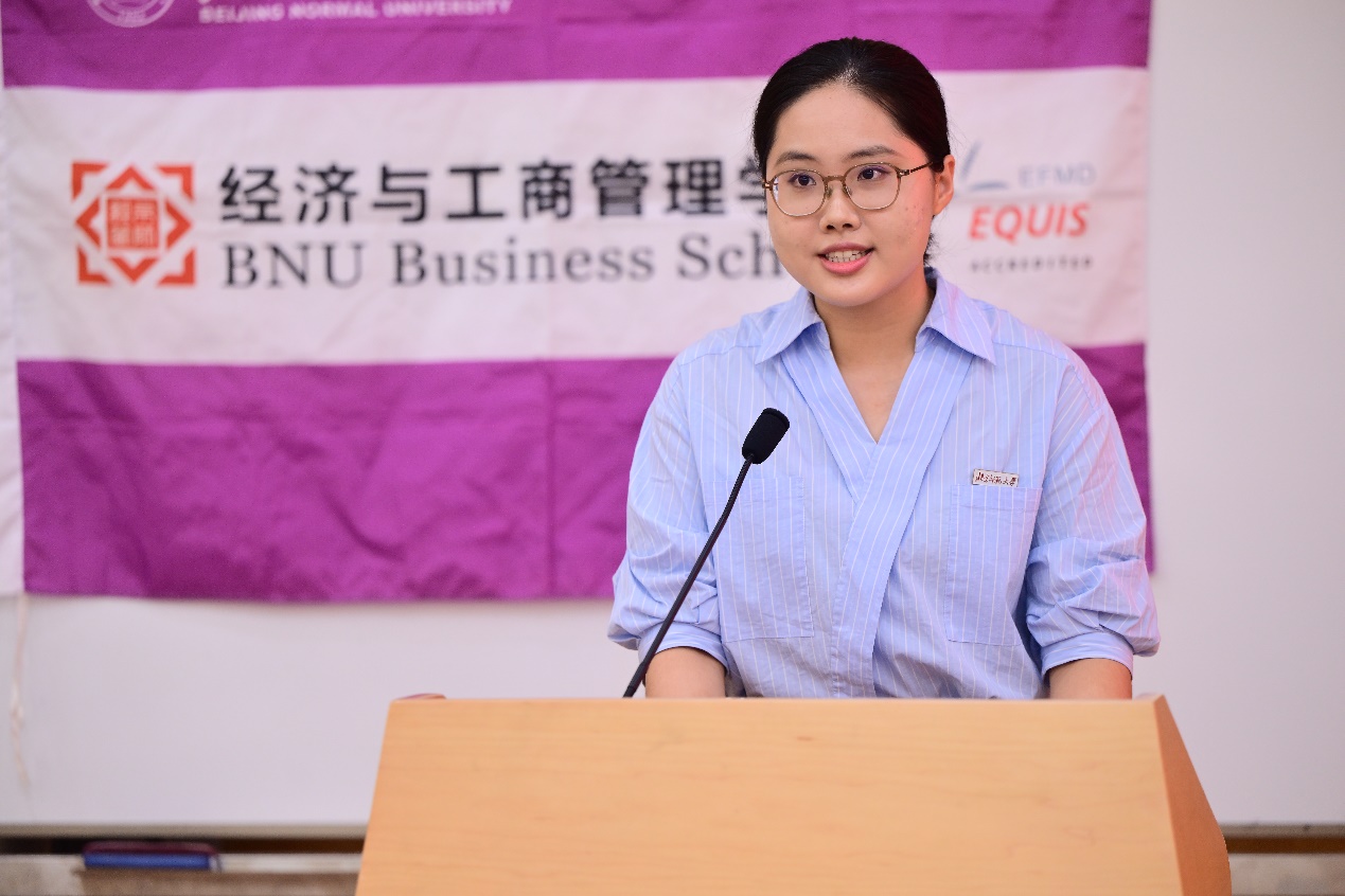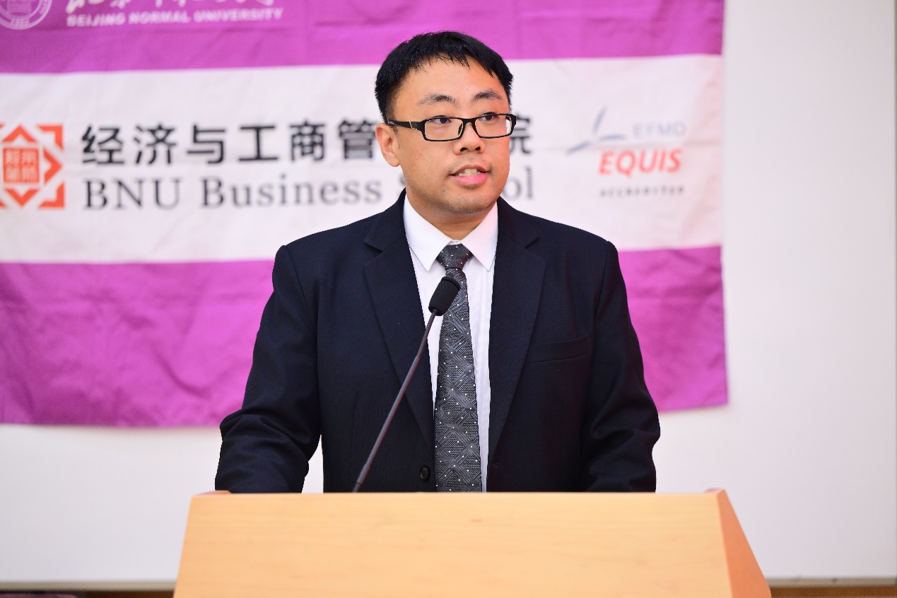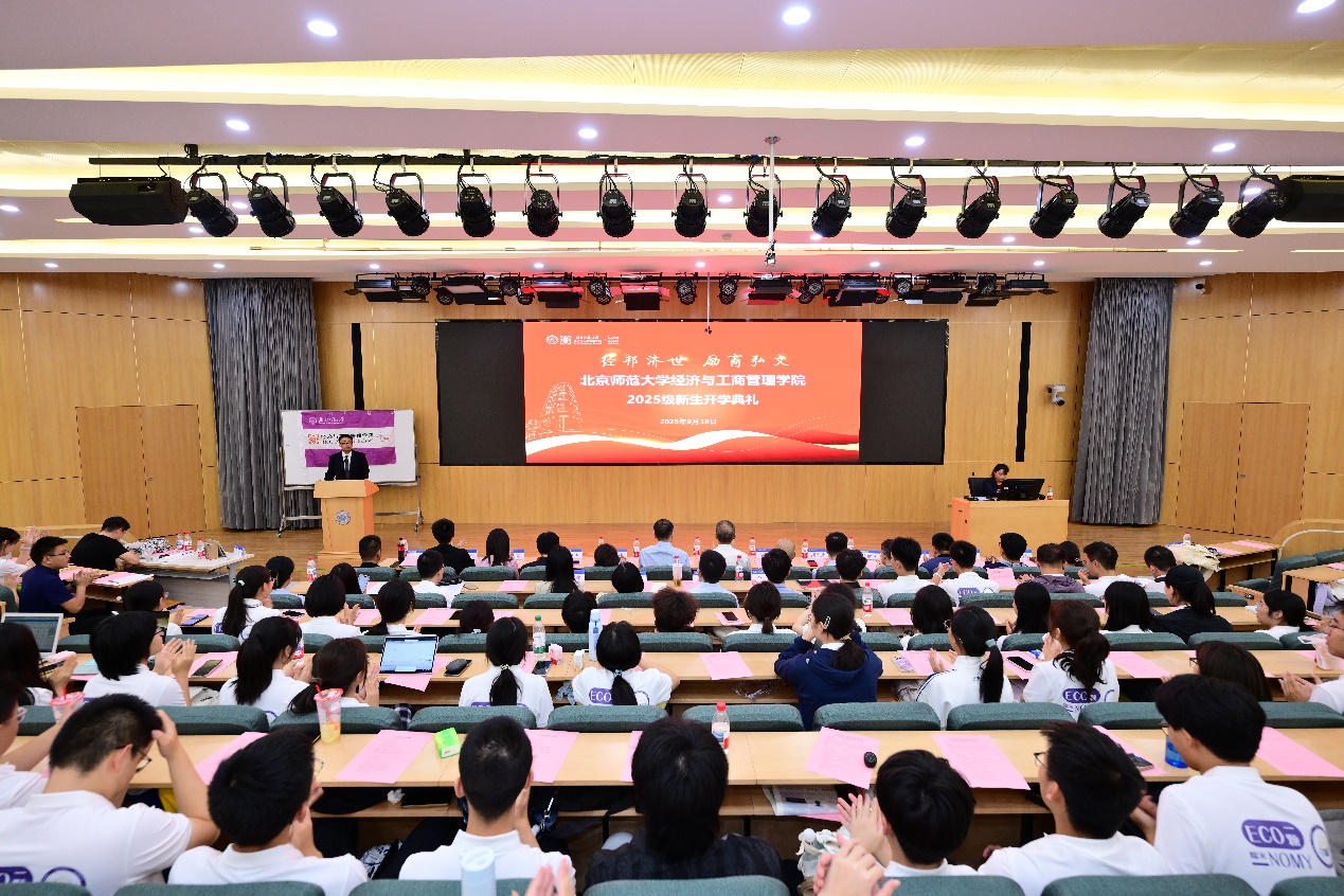 集团财经处处长、公司国际经济与贸易系蔡宏波教授作为教师代表发言。蔡老师在致辞中,明确指出同学们肩负着双重身份:既是传承百年师范荣光与教育报国传统的“北师大人”,又是兼具理性思维与经世济民责任感的“经管人”。他通过分享公司前辈陶大镛先生为国为民做经世致用之学的坚定信念、王善迈先生的家国情怀与求真求实的治学精神,以及一位北师大经管学子毅然扎根西部基层的三则故事,生动展现了北师大经管人始终秉持的家国担当、心系民生与甘于奉献的深厚情怀。他希望同学们能将经济学的理性精神与师范院校的人文关怀深度融合,既有理性之眼,又有仁爱之心,既能构建模型精通算法,又能深入社会解决问题。