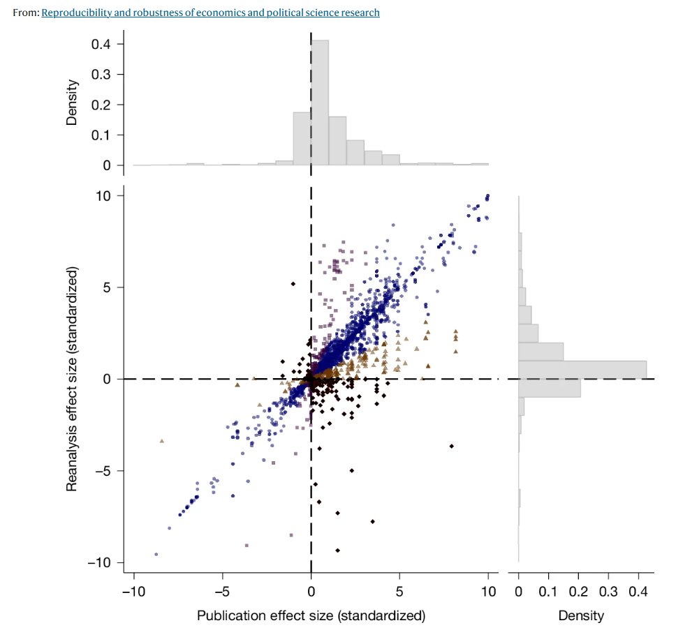 研究团队首先对原论文的分析过程进行计算复现(computational reproduction),并进一步通过替代模型设定和不同估计策略对结果进行稳健性检验。研究结果表明,超过85%的论文结论可以成功复现;在进一步的稳健性检验中,72%的原本统计显著的估计结果仍然保持显著且方向一致,复现得到的效应大小与原论文报告结果高度接近(中位数约为原结果的99%)。整体而言,这些发现表明,在数据开放的条件下,社会科学研究具有较高的可复现性。