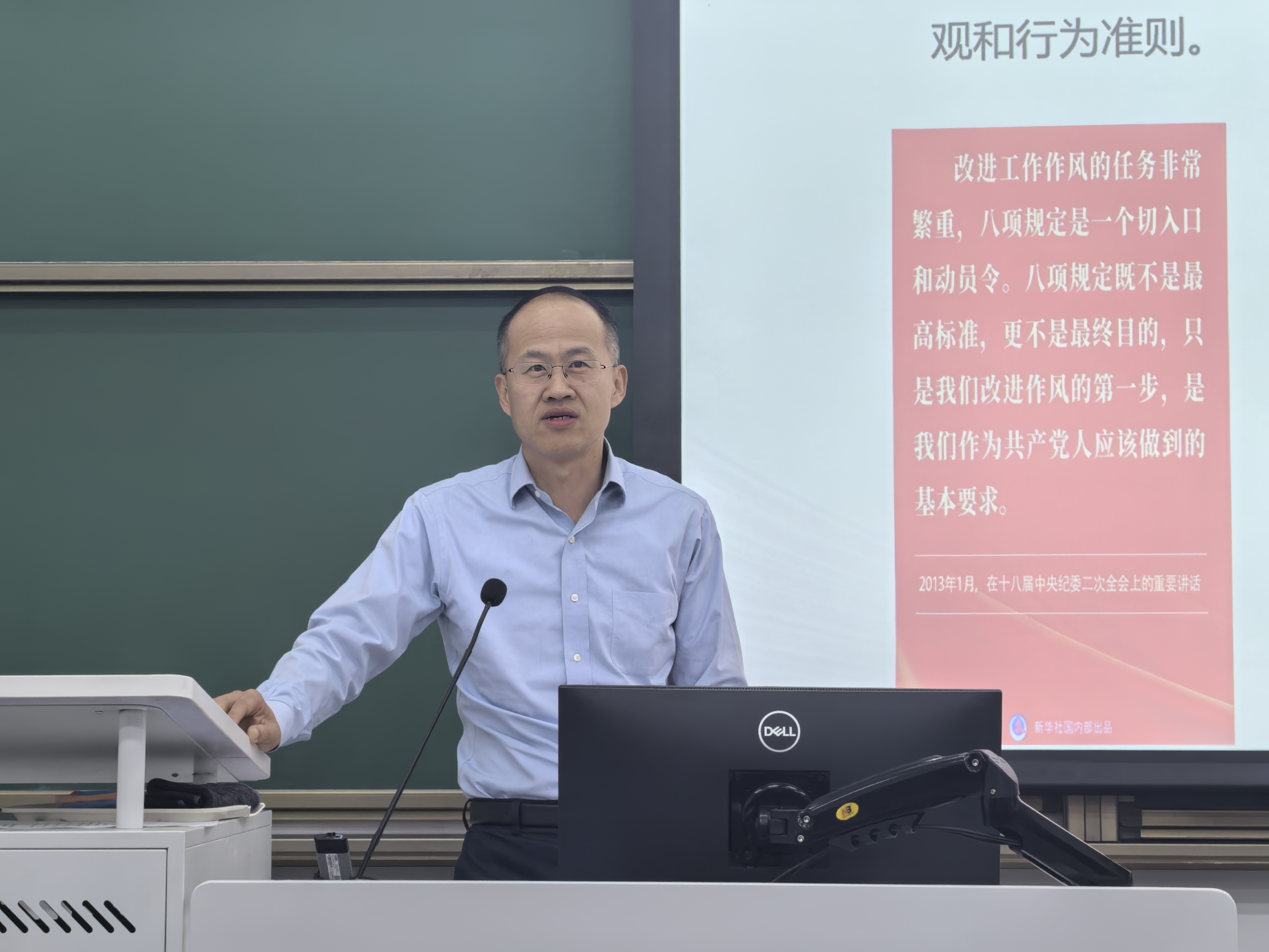 最后,孙老师对新时代老员工党员如何践行中央八项规定精神提出殷切希望。他强调,青年党员要坚定理想信念,锤炼“四有”品格,自觉强化理论武装,坚定“四个意识”,增强“四个自信”,做到“两个维护”。同时,要把纪律规矩意识融入到日常学习和生活中,在言行举止上严于律己,争做崇尚规则的模范。孙老师寄语同学们,要从自身做起,从点滴做起,以实事求是、艰苦奋斗的精神投身社会实践,在服务人民、奉献社会中展示新时代青年的良好风貌。