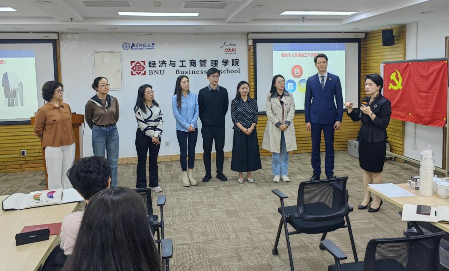 上半场,郭丽重点就教师个人品牌形象管理作讲解培训。首先,她以“形象一变,市场一片”形象地阐明教师个人品牌形象管理的重要性,并详细介绍了教师形象打造的三个关键词:有审美、辨识度、无违和感。其次,她邀请在座的各位老师亲身上台体验,通过互动交流的形式调动起现场的学习氛围,生动地向老师们讲解“形、色、质”这三个元素在个人风格打造中的关键性作用。在讲解的过程中,郭丽多次以喜闻乐见的方式帮助老师们拓展形象管理的专业理论,比如色彩的三个类型、色彩的三个属性,以及衣领在个人形象塑造中的突出作用。再次,根据着装场合的分类,她简洁生动地带领老师们认识到不同场合着装的特征和要领。例如,职场着装讲究庄重干练,社交着装要做到优雅魅力,休闲着装舒适轻松即可。最后,郭丽从风格管理的三要素“量感、廓形、形态”入手,邀请老师们就自身特点进行判断分析,老师们对个人形象特点和风格的把握有了更为清晰的理解。