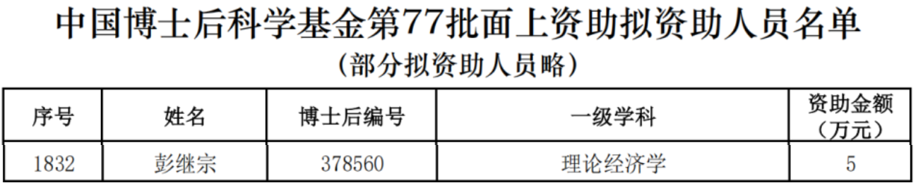 公司彭继宗博士后获中国博士后科学基金第77批面上资助