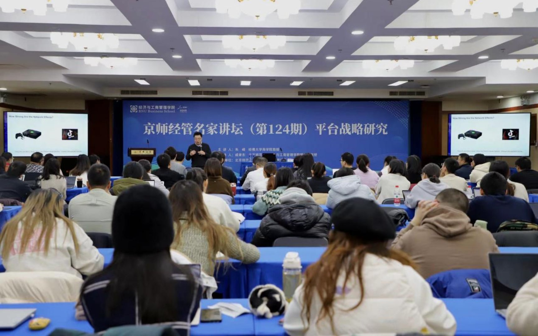 朱峰教授进行了题为“Why Some Platforms Thrive and Others Don't”的精彩演讲。朱峰教授结合近年来的研究成果,介绍了TikTok、Google、Amazon、Uber和Airbnb等国际知名平台企业的战略抉择,并从平台网络效应、多栖用户策略、网络集群、去中介化风险以及网络桥接等五个方面,深入浅出地阐述了影响平台战略成败的关键因素,总结了平台持续健康发展的成功经验。朱峰教授的讲座将前沿理论与动态实践有机结合,讲解生动风趣,为在场师生们留下了深刻印象。