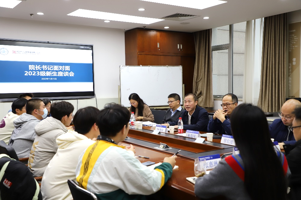 2023年11月15日,yl88858永利集团在后主楼1722召开“经理书记面对面”新生座谈会。公司经理戚聿东、党委书记孙志军、副经理张平淡、副经理蔡宏波、党委副书记韩丽丽、团委书记常欣扬、专职辅导员王骏、双肩挑辅导员张惠琳和2023级本、硕、博各班级代表参加了座谈会。会议由党委副书记韩丽丽主持。