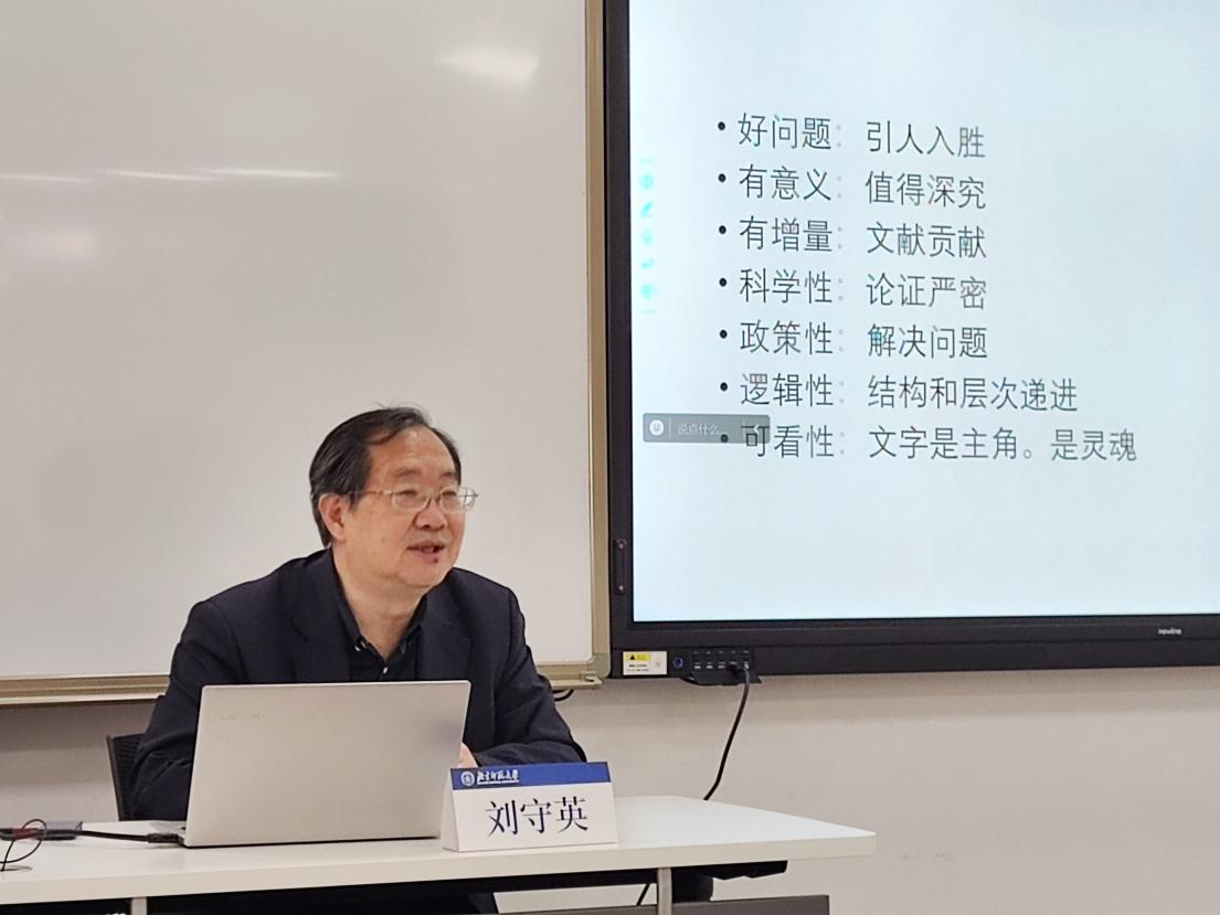 教育部“长江学者奖励计划”特聘教授、中国人民大学经济公司原经理刘守英作《做好科研的几个基本功》专题讲座。他概述了当今学者撰写科研论文的现状,指出了青年学者科研活动存在的问题,讲解了开展实地调查的方法和以问题导向的研究方法。最后,刘守英教授结合国家政策就如何做一个好的政策咨询者提出了建议,强调青年学者要提高政治站位,强化使命意识,打磨科研基本功,以高质量的科研成果服务国家重大需求。
