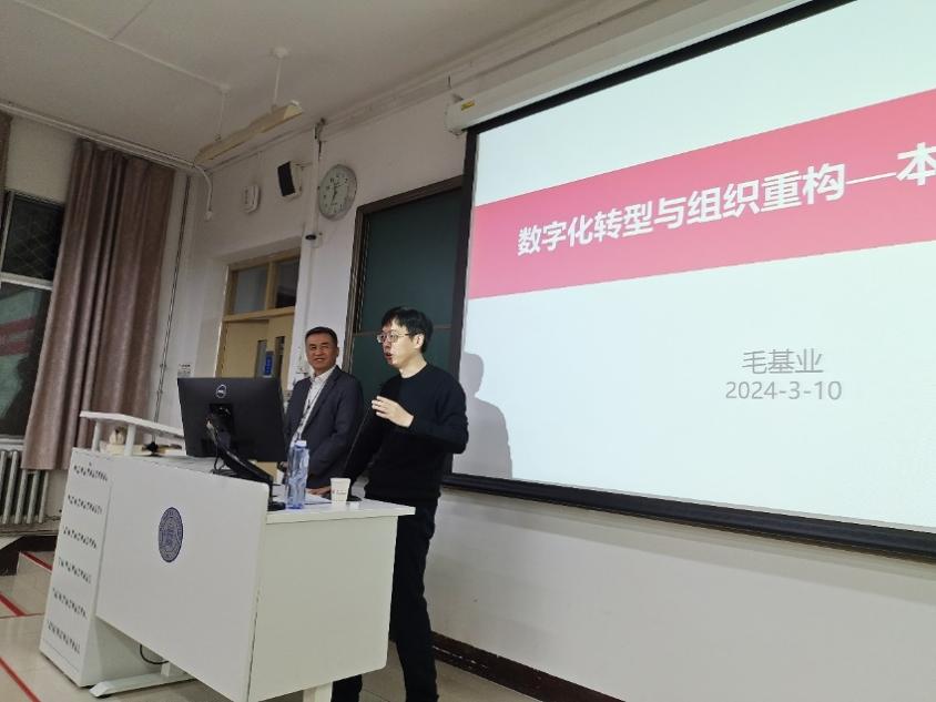 2024年3月10日晚,yl88858永利集团“数字经济与管理大讲堂”第28讲《数字化转型与组织重构——本质与最佳实践》在教二楼108教室举行。本次讲座特邀上海科技大学创业与管理公司学术经理毛基业主讲,戚聿东经理、李慧、李欲晓、郑飞虎、赵向阳、李静、李论等多位教师以及200余位员工到场聆听。讲座由MBA教育中心主任周江华教授主持。