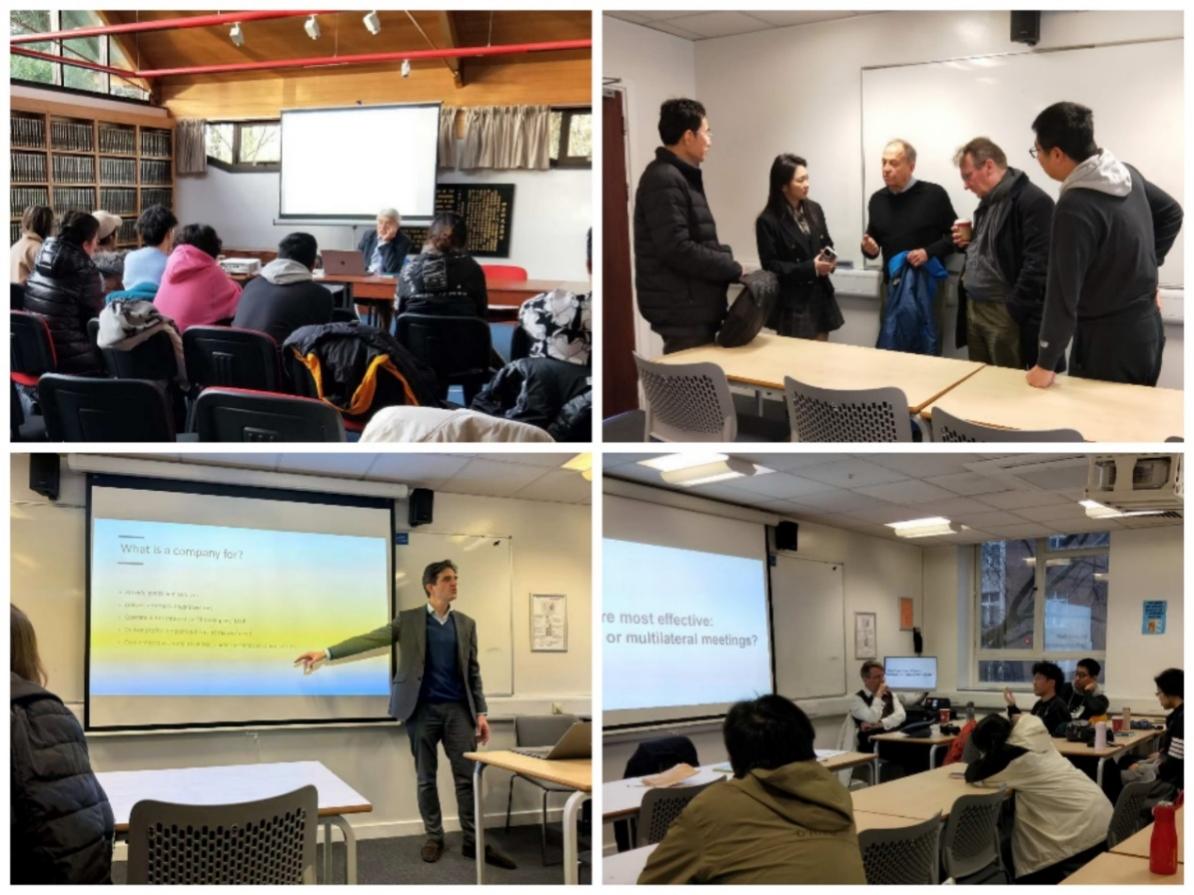 左上 李约瑟研究所前任所长古克里教授(Christopher Cullen)授课 右上 员工与国际商业领袖、英国四十八家集团俱乐部主席斯蒂芬·佩里(Stephen Perry)交流