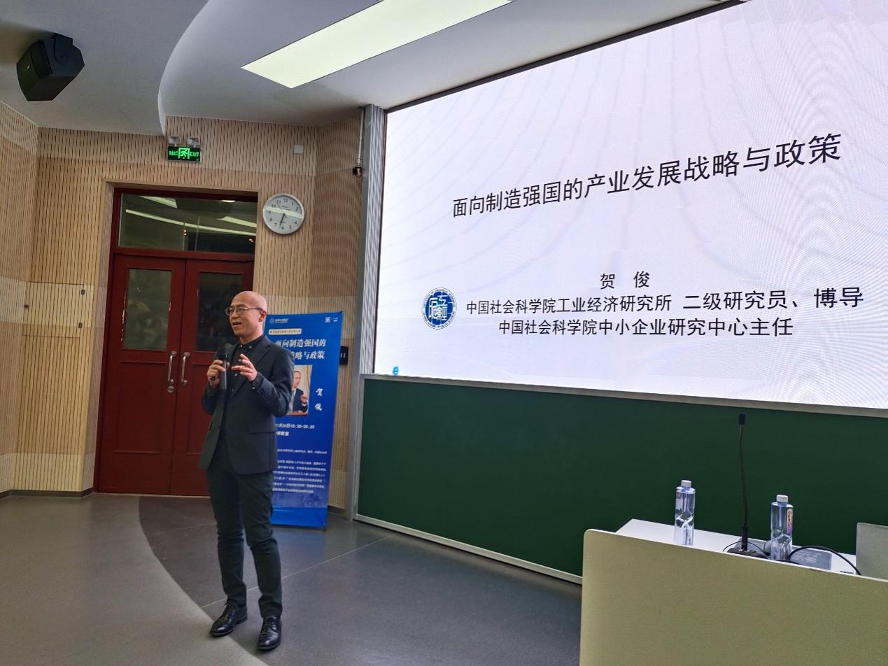 贺俊研究员首先结合具体实例介绍了产业和产业发展的机制。他着重介绍了市场治理、行政治理和社群治理这三种产业发展的机制,尤其结合不同国家产业发展实例,深入浅出地应用经济学原理对不同产业发展路径进行了清晰透彻的分析。然后,他对中国制造强国的战略和政策进行分析,结合其他国家制造强国的主要模式,指出了中国制造强国可能的产业战略和关键路径,尤其指出了具有中国特色的专精特性企业的成长模式。最后,贺研究员和同学们进行了充分的沟通交流,帮助同学们答疑解惑,现场互动氛围十分热烈。