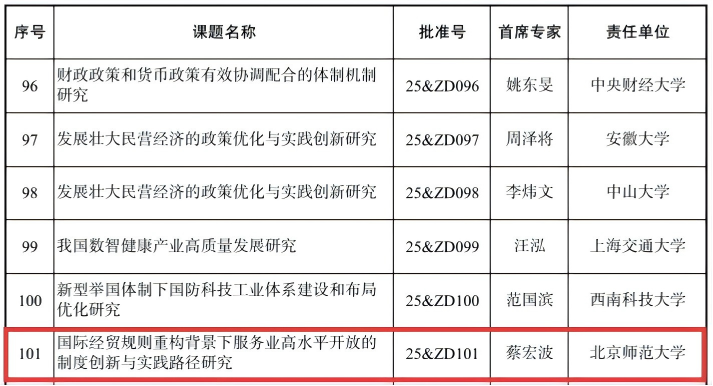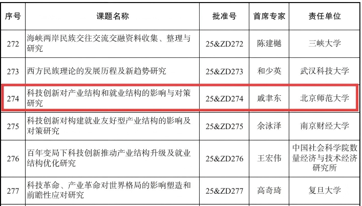 公司戚聿东教授牵头的 “科技创新对产业结构和就业结构的影响与对策研究”项目,聚焦科技创新驱动下经济结构转型的核心命题,直面产业升级与就业保障的现实挑战,其研究成果有望为国家制定相关政策提供重要的理论支撑与实践参考。蔡宏波教授牵头的 “国际经贸规则重构背景下服务业高水平开放的制度创新与实践路径研究”项目,紧扣全球经济治理变革的时代脉搏,聚焦服务业开放这一关键领域,旨在探索符合中国国情的制度创新模式与开放路径,对提升我国服务业国际竞争力、推动高水平对外开放具有重要意义。此次重大项目的立项,体现了学科紧扣时代需求、服务社会重大现实问题的研究导向与学术担当。