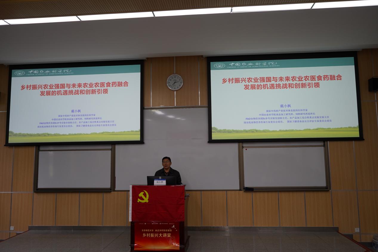 戴小枫研究员作了题为《乡村振兴农业强国与未来农业农医食药融合发展的机遇挑战和创新引领》的学术讲座,在讲座中深度解析乡村振兴与未来农业融合发展新路径。作为国家中药材产业技术体系原岗位科学家、农业农村部科学技术委员会委员,戴小枫研究员结合三十余年科研实践,系统阐述了我国农业现代化转型的战略方向。他提出人类农业历经四次革命演进,从原始农业的采摘渔猎、传统农业的农耕文明、现代农业的工业化生产,正加速迈向以营养健康为本质特征的未来农业阶段。他强调实施乡村振兴需要聚焦产业融合、文化赋能和科技下乡三大路径,发展中央厨房、智能餐厅等新业态,保护传统村落文化生态。戴小枫呼吁学术界加强营养靶向设计、肠道微生态调控等交叉领域研究,为农业强国建设提供科技支撑。