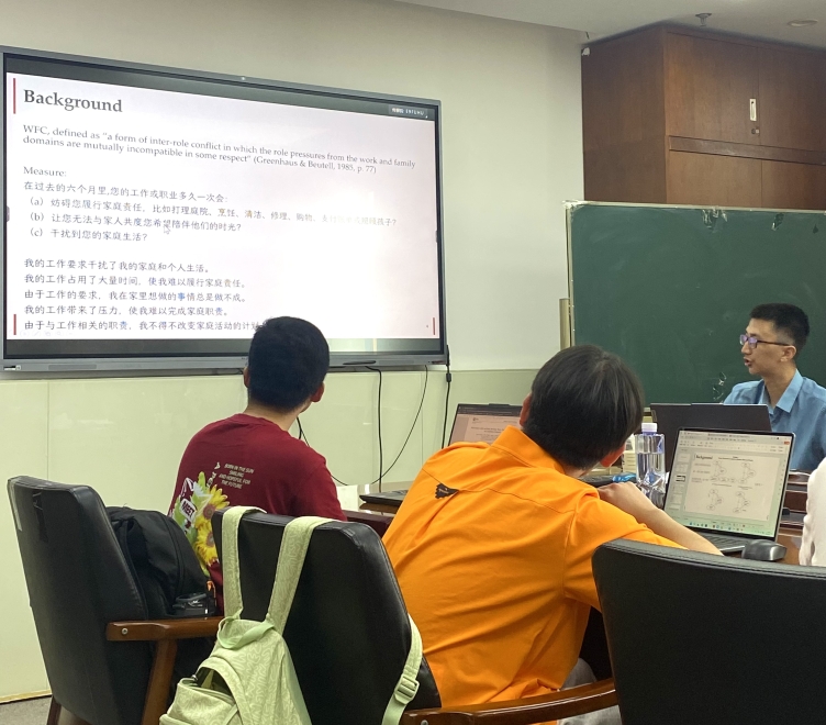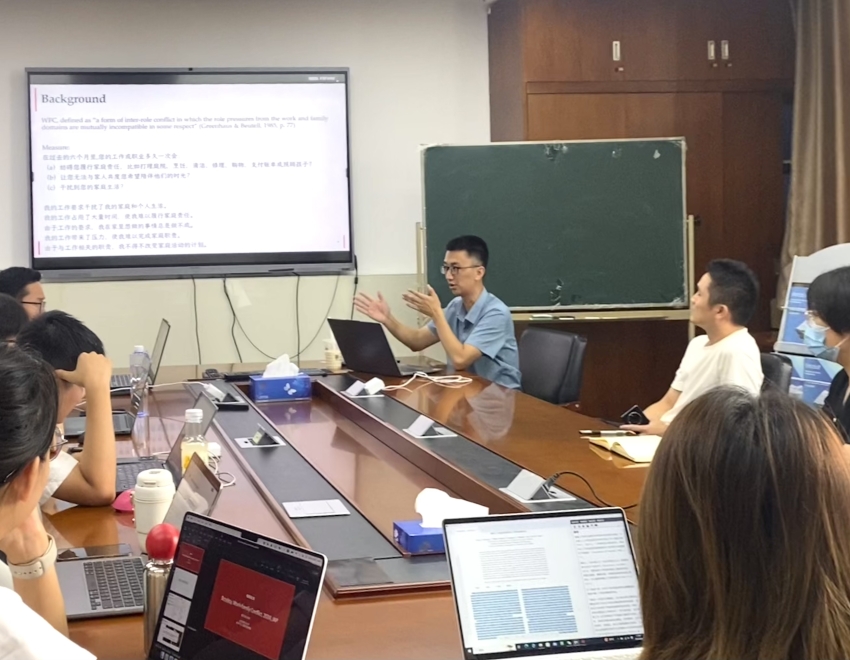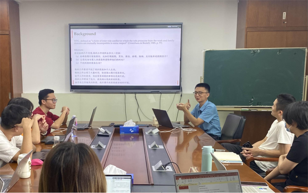 本次研讨会围绕最近发表在JAP 以及JOB上有关工作家庭冲突(WFC)的最新进展。蔡子君老师首先对工作家庭冲突(WFC)这个概念进行了介绍,指出它根源于个体在生活空间中的多角色性以及角色职责之间的不相容性。然后,他提出了一个核心问题:“WFC导致了压力的增加,还是压力增加加剧了WFC?”这一“先有鸡还是先有蛋”的问题引发了与会者的浓厚兴趣。