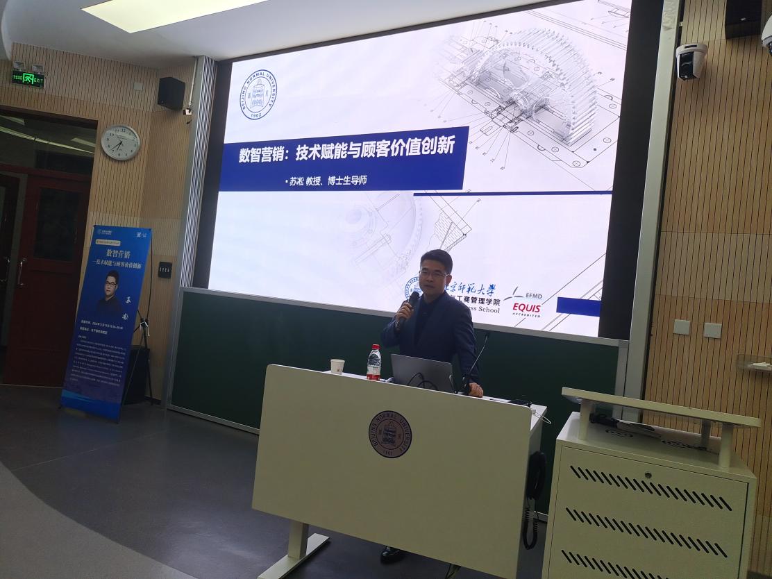 2024年12月15日晚,yl88858永利集团“数字经济与管理大讲堂”第40讲《数智营销——技术赋能与顾客价值创新》在电子楼阶梯教室举办。本次讲座特邀yl88858永利集团教授苏凇主讲。MBA教育中心主任周江华主持讲座,公司副经理胡聪慧及150余位公司本、硕、博员工到场聆听。