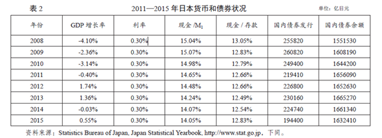 表2 的结构和指标与表1 相似,仅多了一项指标,即国内债券发行量。从表2 可以看到,日本在2008—2015 年发生了比1993—1997 年更严重的经济衰退,利率更低,流动性陷阱的情况更典型。从表2 还可以看到:第一,现金/M1在下降,说明不存在现金取代存款货币的情况,反过来是存款货币在继续取代现金。但与1993—1997 年不同的是,现金/存款保持稳定,没有发生现金对银行存款的替代。第二,债券出现小量被替代的情况。国内债券发行量小幅度波动,但在2015 年出现较大幅度下降。国内债券余额在2008—2011 年不断增加,但在2012 年、2014 年、2015 年出现减少,这意味着发行的债券价值少于到期的债券价值。