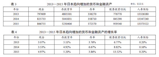 从表3 和表4 可以看到,这个时期,在一定程度上出现收缩的债券资产部分被股票资产和保险资产所替代,部分被属于M2 的存单资产所替代,部分被属于M1 的现金和存款货币所取代。值得注意的是,日本政府债券利率在2015 年4 月22 日以后间歇性地出现负数,人们在货币资产和金融资产之间进行重新配置,所以出现了上述的资产替代情况。