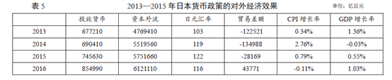从表5 可以看到,日本宽松的货币政策是有一定效果的。货币供给增加促进了资本外流,导致日元汇率贬值,从而推动了出口,日本对外贸易从2013 年的高额逆差转变为2016 年的顺差,对于产值的增长发挥了一定的作用。这就是说,如果日本不这么做,其经济将会更糟糕。但是,从国内生产总值增长率来看,日本的这种宽松货币政策难以带来其经济复苏。