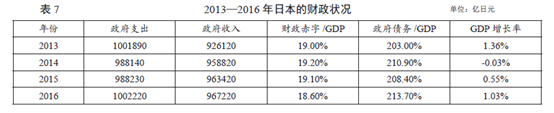 仍然以日本为例。安倍在2012 年12 月就任日本首相以后,不仅实行激进的货币政策,而且还实行温和的财政刺激方案。在支出方面,增加对灾后重建、创造财富和生活安全三个领域的支出;在税收方面,对个人储蓄账户中的金融资产投资提供税收优惠,继续施行对贷款购房和投资房产的税收优惠政策,但对4 亿日元以上的个人所得增加了45% 的税率档次。这些措施在总体上对财政赤字有所约束。2013—2016 年日本政府的财政状况如表7 所示,政府支出和政府收入的数据来源于日本财务省,财政赤字的数据来源于日本统计局,政府债务数据来源于国际清算银行,包括中央和地方政府债务。
