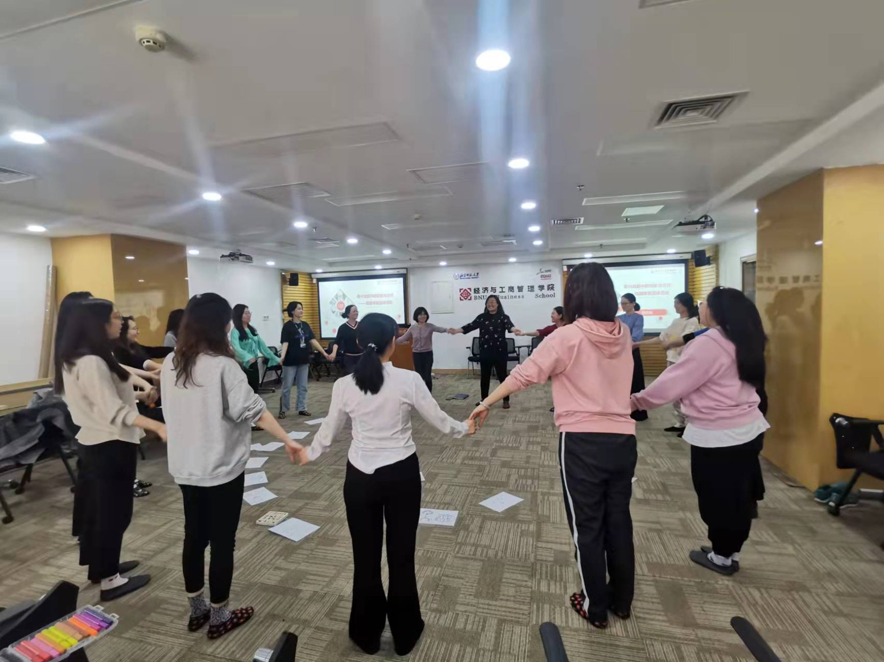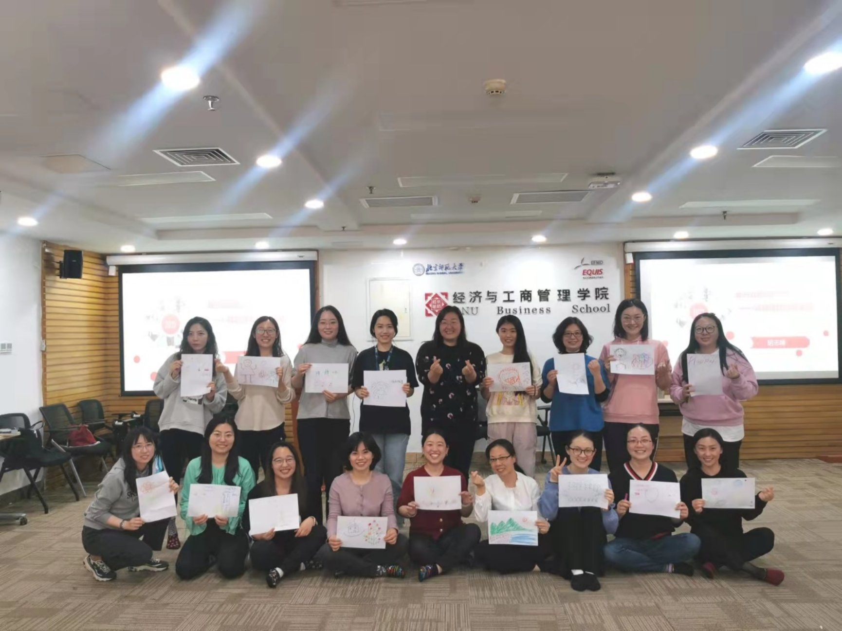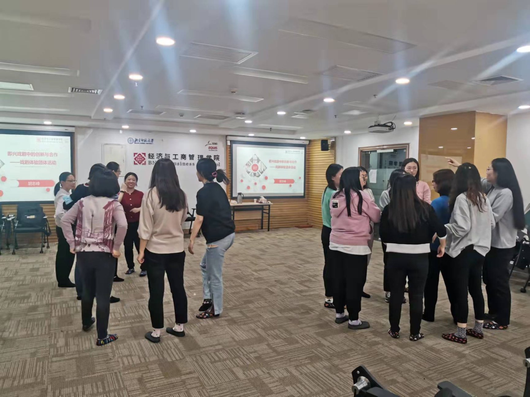 终于到了培训当天,怀着对主题的好奇和期待一进入9406,就看到了活力满满的胡志峰老师,一位将戏剧与心理治疗与疏导相结合的奇女子。在胡老师的带领下,我们通过“照镜子”(两两一组,相互模仿动作)的小游戏,活动开了我们那因久坐而早已僵硬的肩膀和腰腿,也甩掉了各种拘束。随后我们分为两组,通过随机情景设定,在三分钟内完成一个又一个简短的戏剧表演,平日严肃认真的同事们演绎了“太空漫步”、“沙漠寻宝”等一系列脑洞大开的剧情,展现了丰富的想象力,也在过程中加深了我们的协作意识与能力。活动的最后,当我们就像小时候那般围坐在地,分享自己的心情,为自己的心灵进行了一次疗愈。在我即将调岗、离开经管院前,感谢能有机会参与这个活动,并且通过分享向大家说出自己的心里话。我是幸运的,能加入经管院这样一个亲如一家的大集体,也感谢公司为我们行政岗位员工举办的各类培训活动,拓宽了我们的视野,疗愈了我们的内心。经管院,遇见你,三生有幸!
