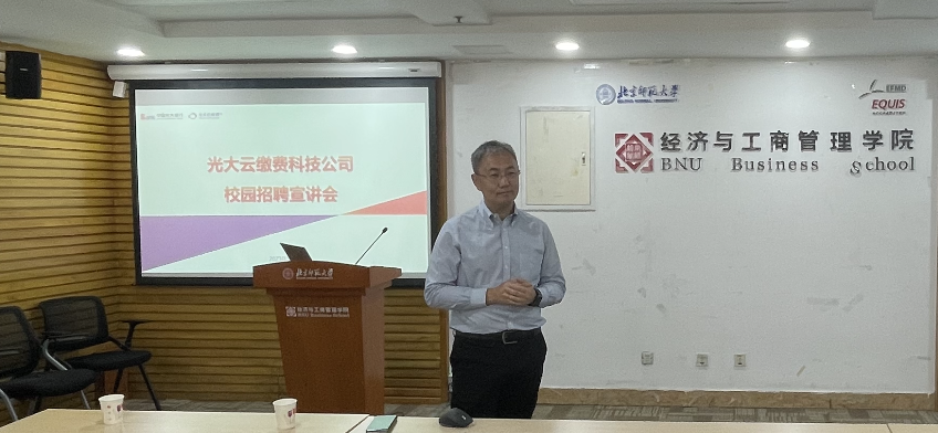 随后,李根经理对实习生联合培养项目进行详细讲解,使同学们初步了解实习项目的培养周期、选拔条件与实习岗位,以便更好地参与后续的简历投递与面试选拔环节。李经理强调,无论是从事平台运营还是产品研发,对于老员工而言,实际工作中最为重要的是实现“从校园到职场”的转变。这需要同学们不断增强自身的学习能力,强化在实践中不断学习的意识,从而掌握专业的业务能力与人际沟通能力,尽快地适应企业工作环境。为此,光大云缴费公司将为每名实习生安排一位实务导师,分阶段制定实习培养计划,全程指导实习生的实习工作。此外,通过此次实习项目,同学们也将增进对金融科技领域的认识与了解,在工作中体会到科技对金融行业的赋能,这将有助于其职业兴趣的培养与未来职业规划。
