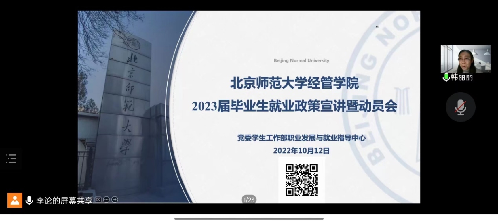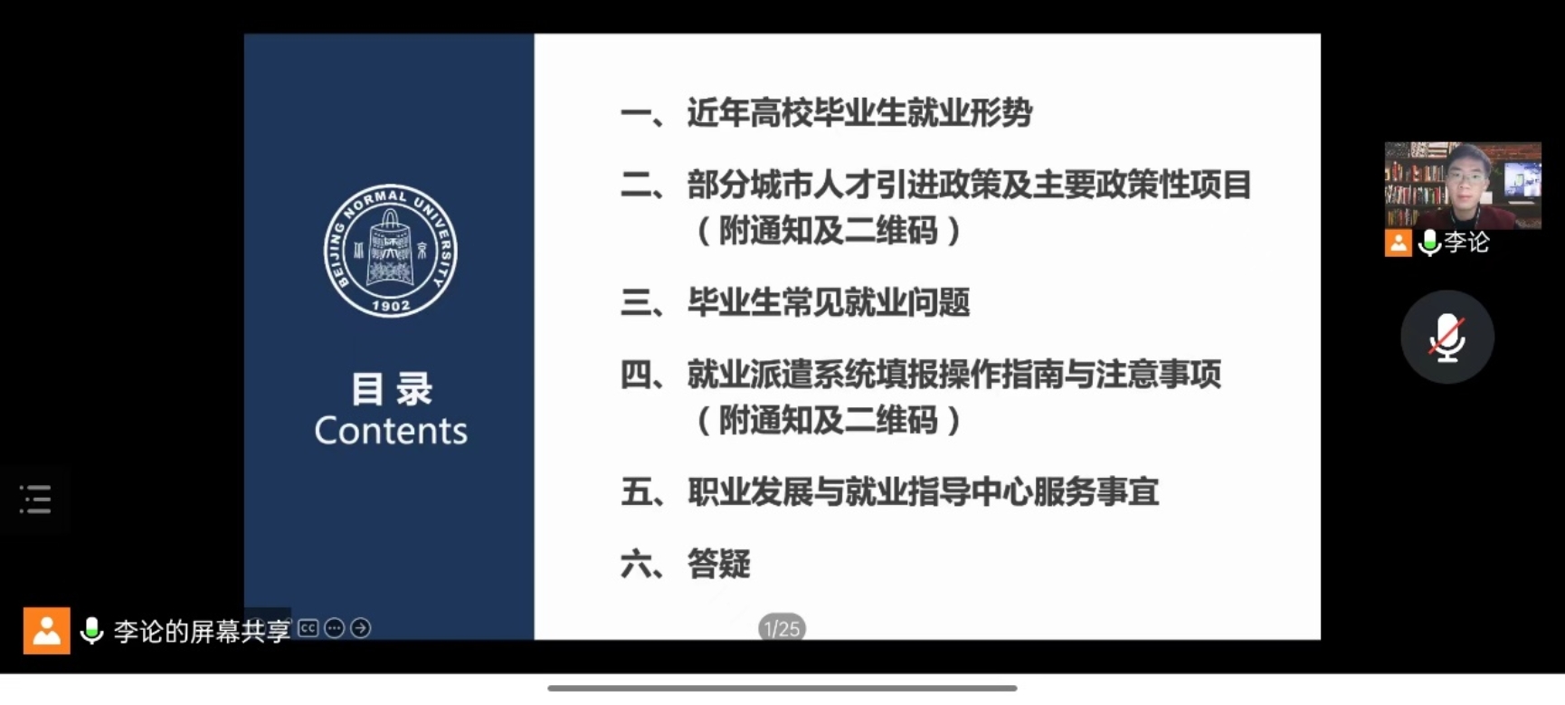 之后,李论老师主要从以下六个方面为同学们介绍了相关的就业政策。第一,对近年来高校毕业生的就业形势进行了介绍与分析,帮助同学们了解当前较为严峻的形势以及公司毕业生的主要去向。第二,为同学们介绍了我国部分城市人才引进政策以及主要的政策性项目,包括北上广深等一线城市与成都、杭州、西安等新一线城市的落户条件和落户政策,以及三支一扶、特岗教师、志愿服务西部计划、老员工参军入伍、国际组织实习项目、科研行政助力、保研等与毕业生有关的其他政策性项目。第三,对就业准备、签订三方协议、户档转迁、改派手续等毕业生常见的就业问题进行了详细介绍。第四,为同学们介绍了就业派遣系统填报的操作指南与注意事项,并提醒各位毕业生同学尽快登录就业派遣系统,完善自己的毕业信息。第五,介绍了公司就业指导中心的服务架构及其提供的各项服务,为同学们日后寻找求职帮助提供了详细指南。最后是答疑环节,针对大家目前存在的问题,李论老师与同学们进行了充分的沟通交流,并表示未来还会定期以线上会议的形式,为同学提供就业方面的指导和建议,陪伴同学们度过紧张忙碌的求职毕业季。