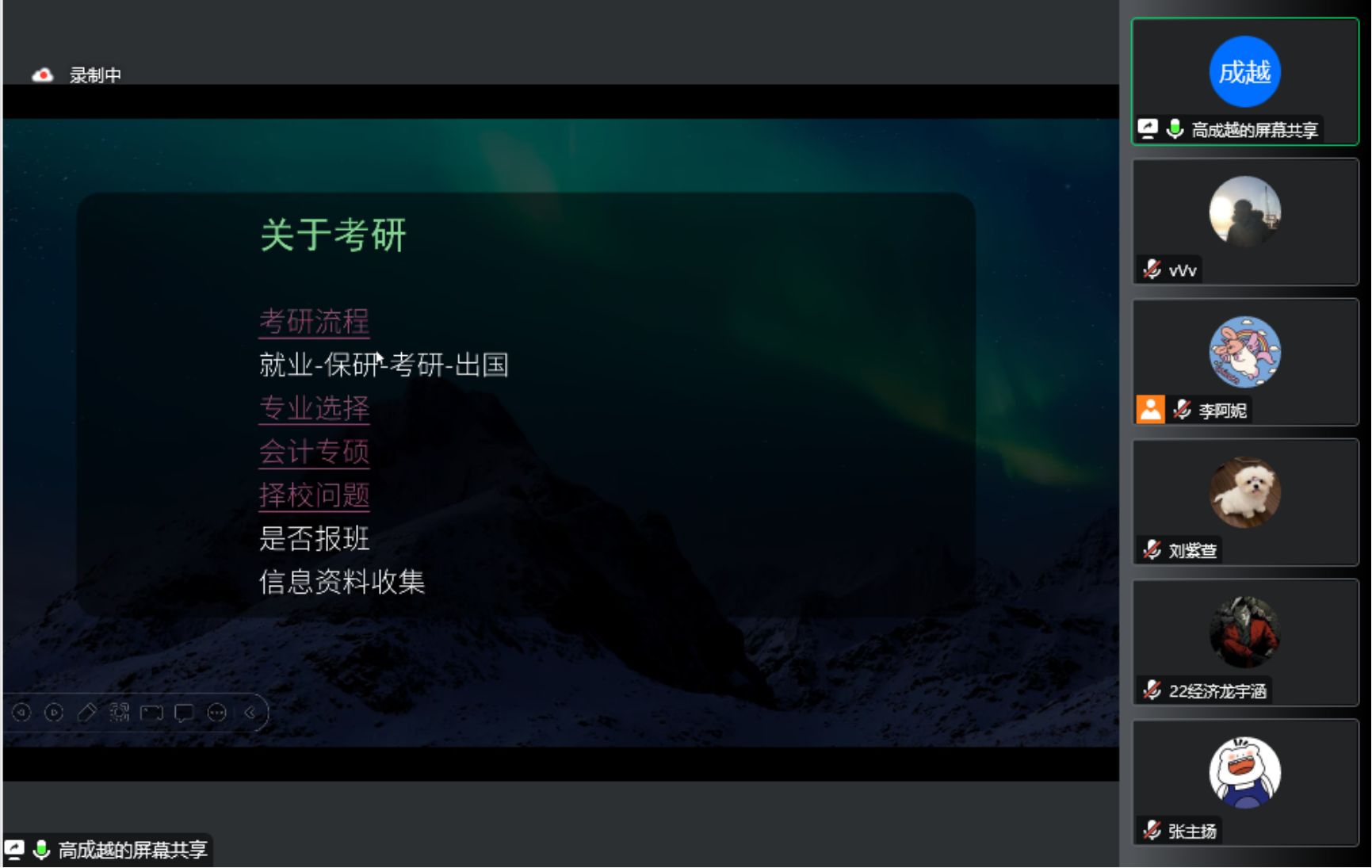 首先,高成越就前期同学们提出的问题进行了解答,详细分享了自己关于考研流程、公司及专业选择、辅导班和信息资料收集等方面的经验。
